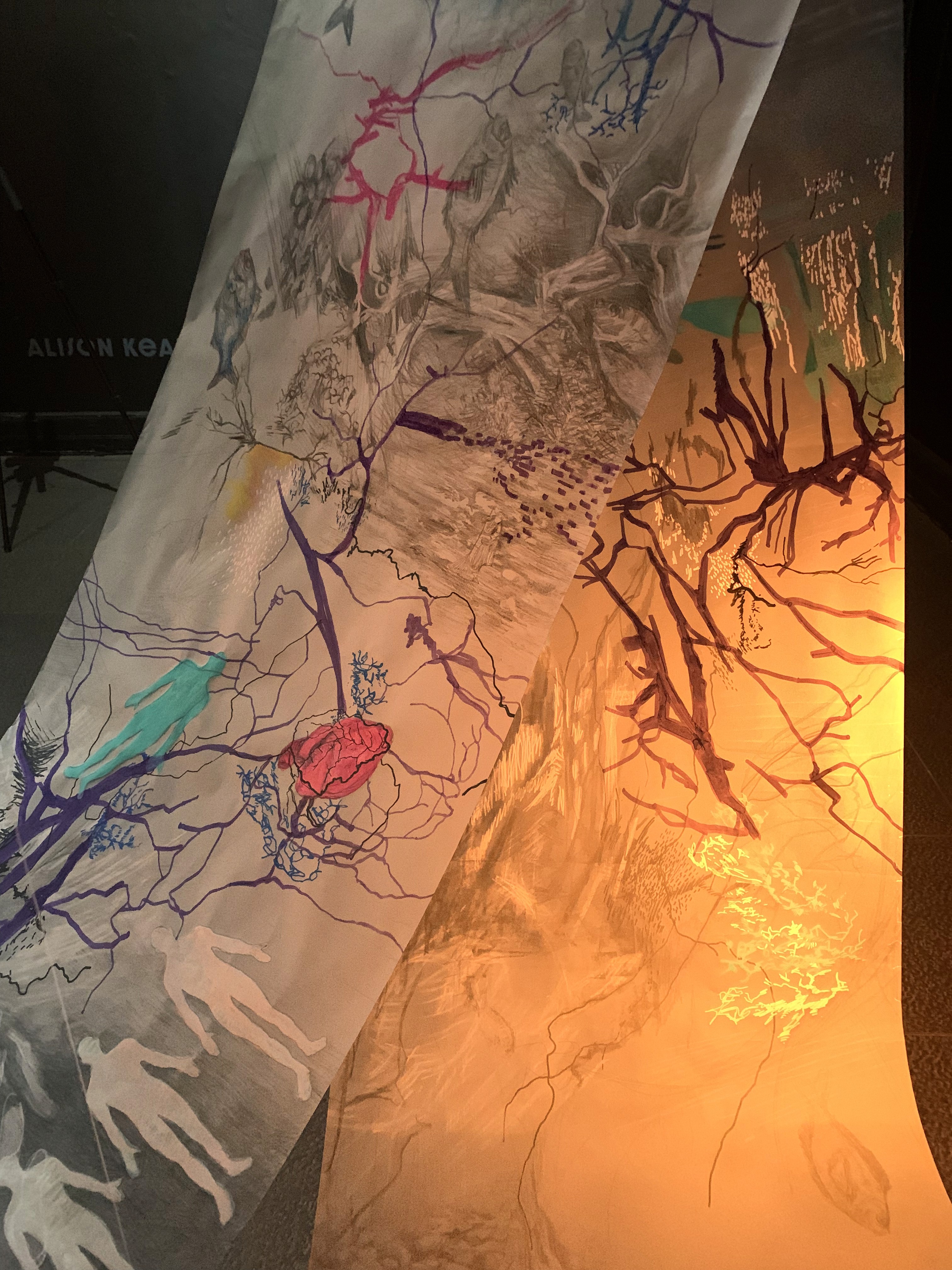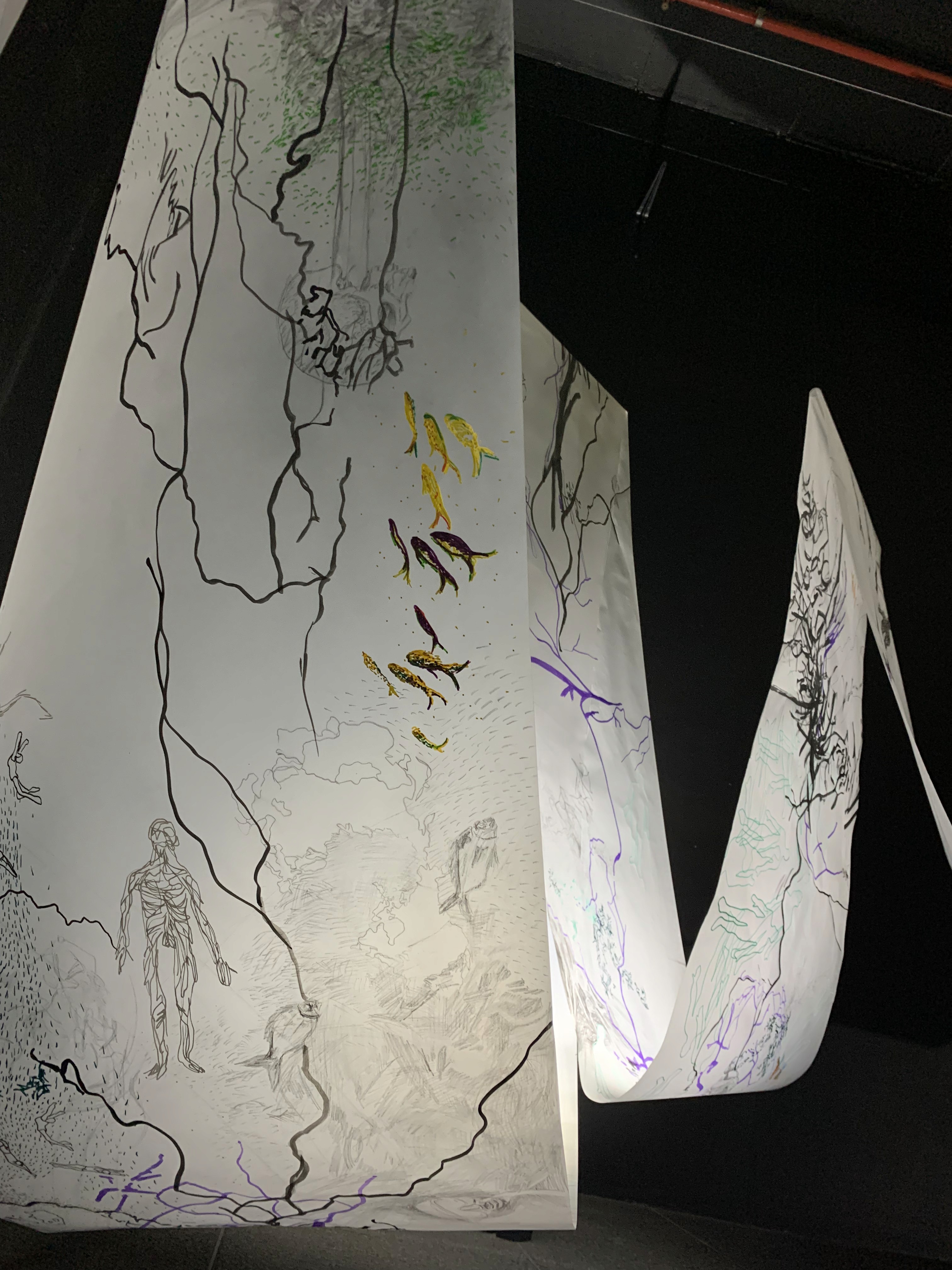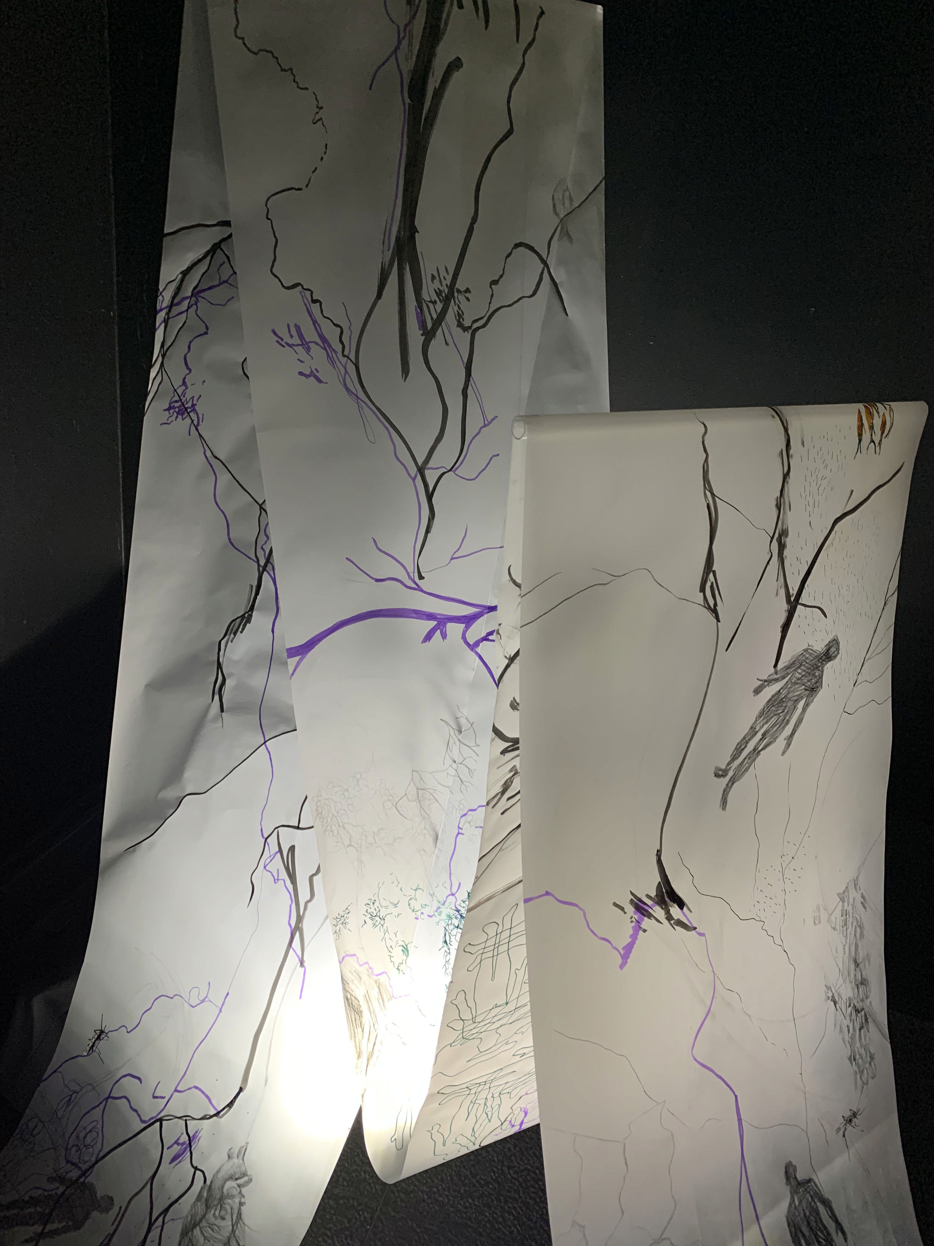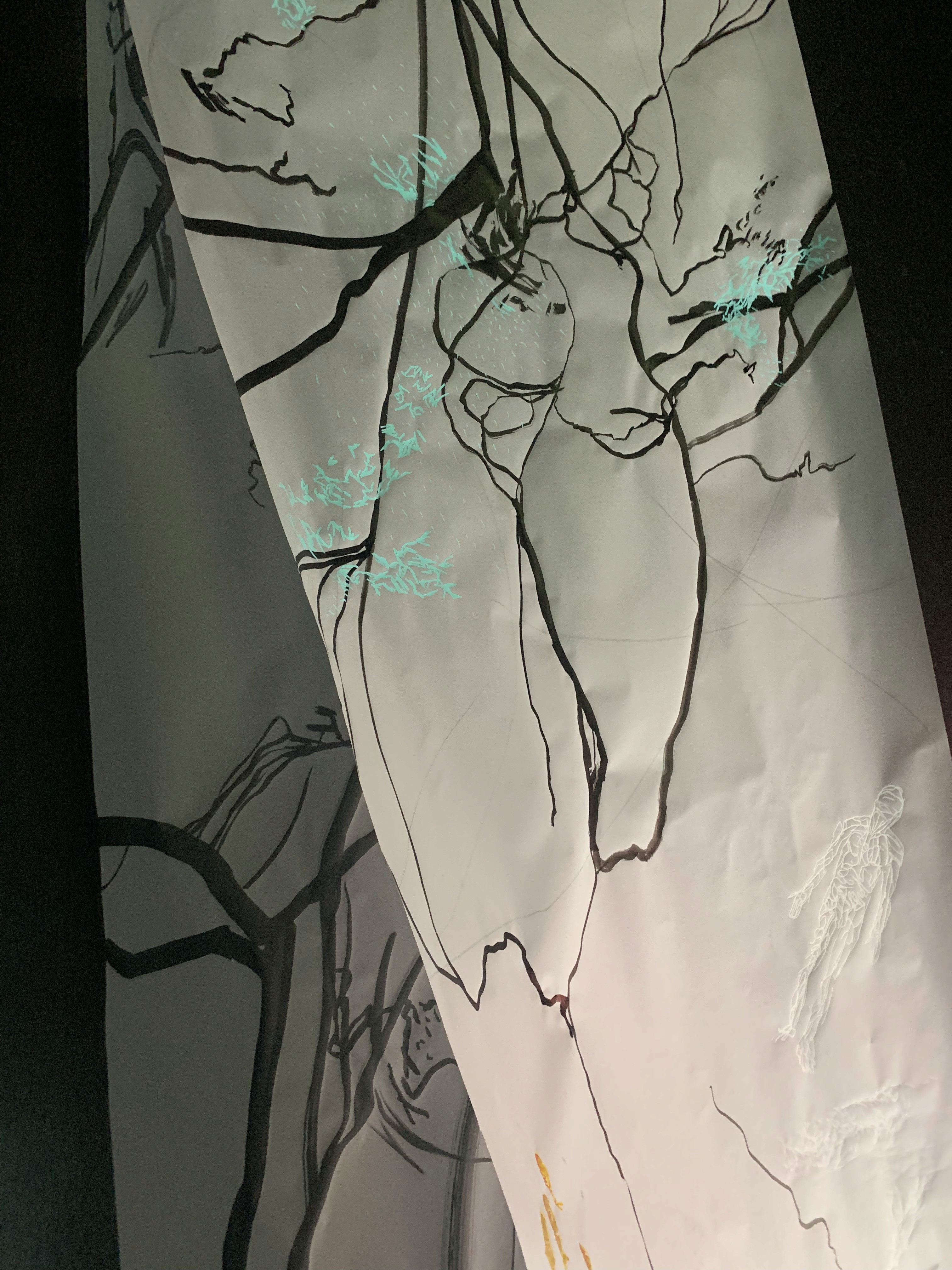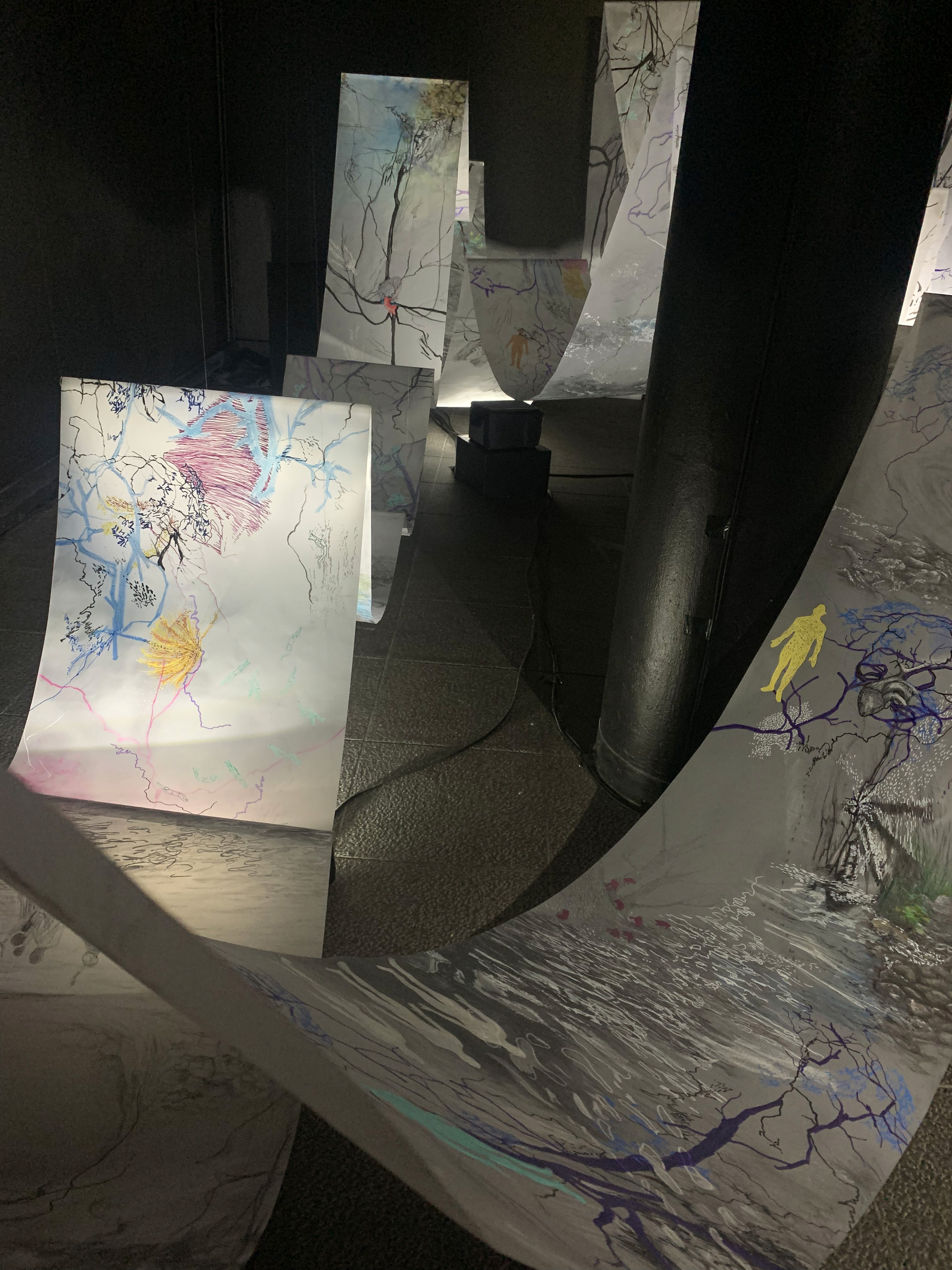 The 68 kilo-meter long Juksei, runs through the poorest and wealthiest parts of Johannesburg, is used for washing, ablutions, baptisms and recreation. I decided to create a drawing, with the scale of 1:2000m, mapping the social realities and cultural complexities of the Jukskei river. The length of the drawing is 34m. This was my first time working on such a large drawing. It took 6 months of drawing daily, to get to this length. I could only see 1.5m of the drawing, at a time, while working; the drawing literally unrolled, as the months passed. I used semi-transparent paper, and worked on both sides, to visually represent the process of reflecting, looking below the surface, to understand the complex dynamics and significance of the river, and the impact of humans on the ecosystem. The time and scale afforded me a chance to experiment with materials, symbolism, complexity, space, scale changes and repetition. The drawing is a portrait of sorts; homage and lamentation. I wanted it to be crazy: big, beautiful and glowing, but also horrific, not shying away from the floating pollution, and dead bodies that have been found there. I shared images and videos of work in progress, with Gavin and Cameron who worked on the sonic component of the installation. After months of working together, I see conceptual, material and formal links between the drawing and the sonic elements.