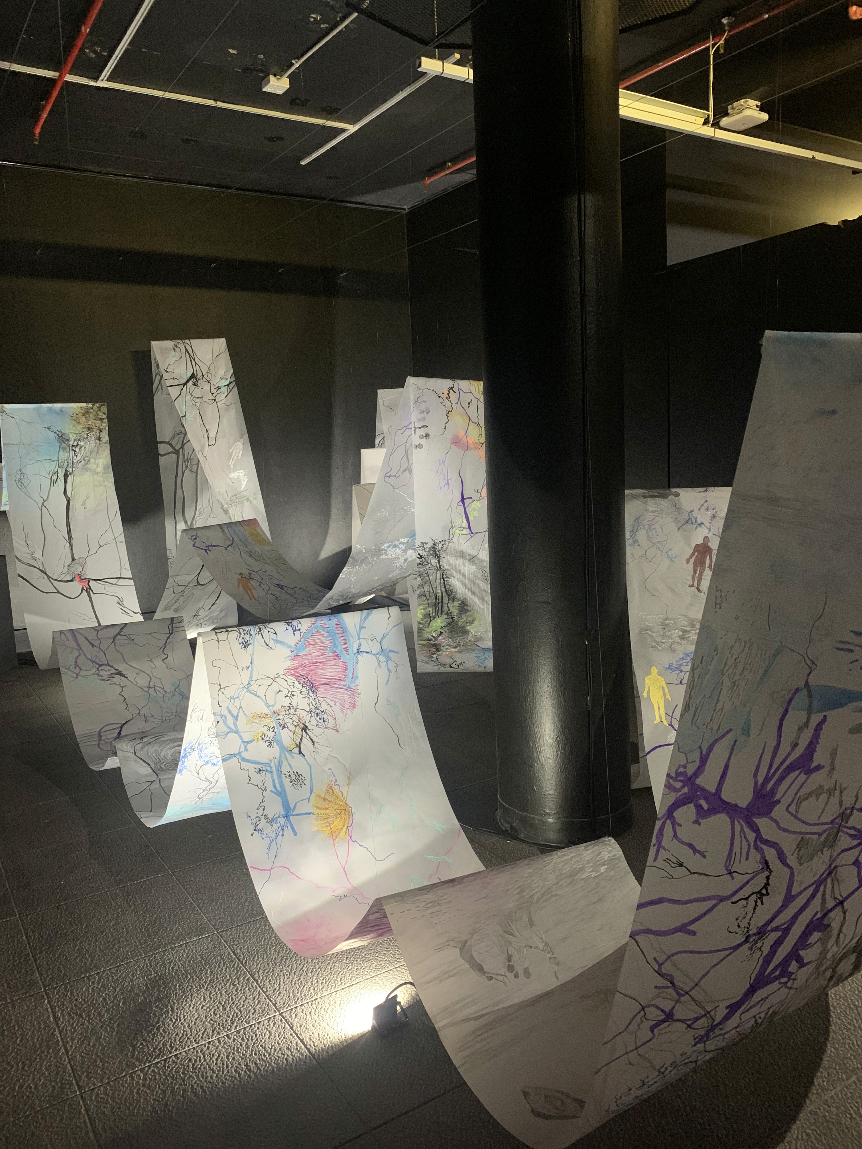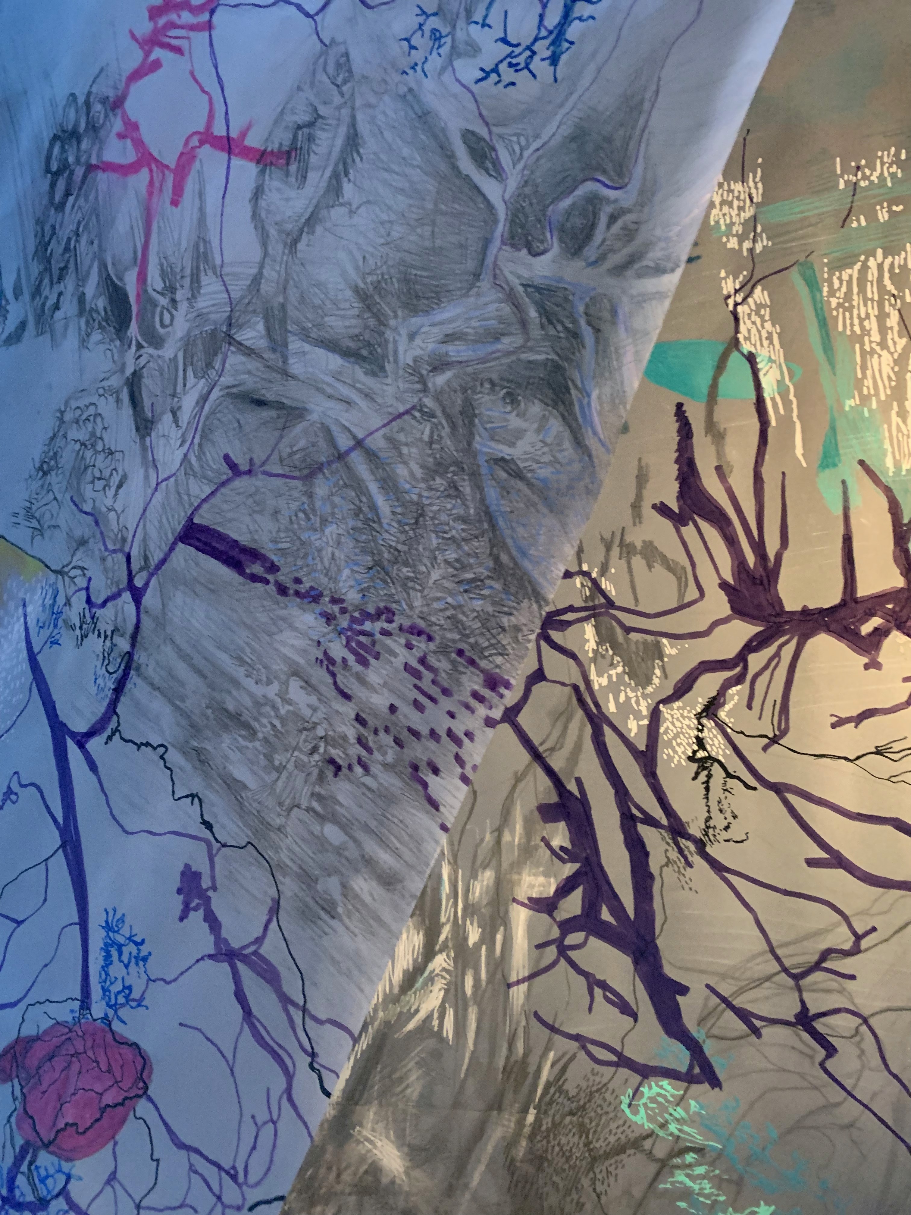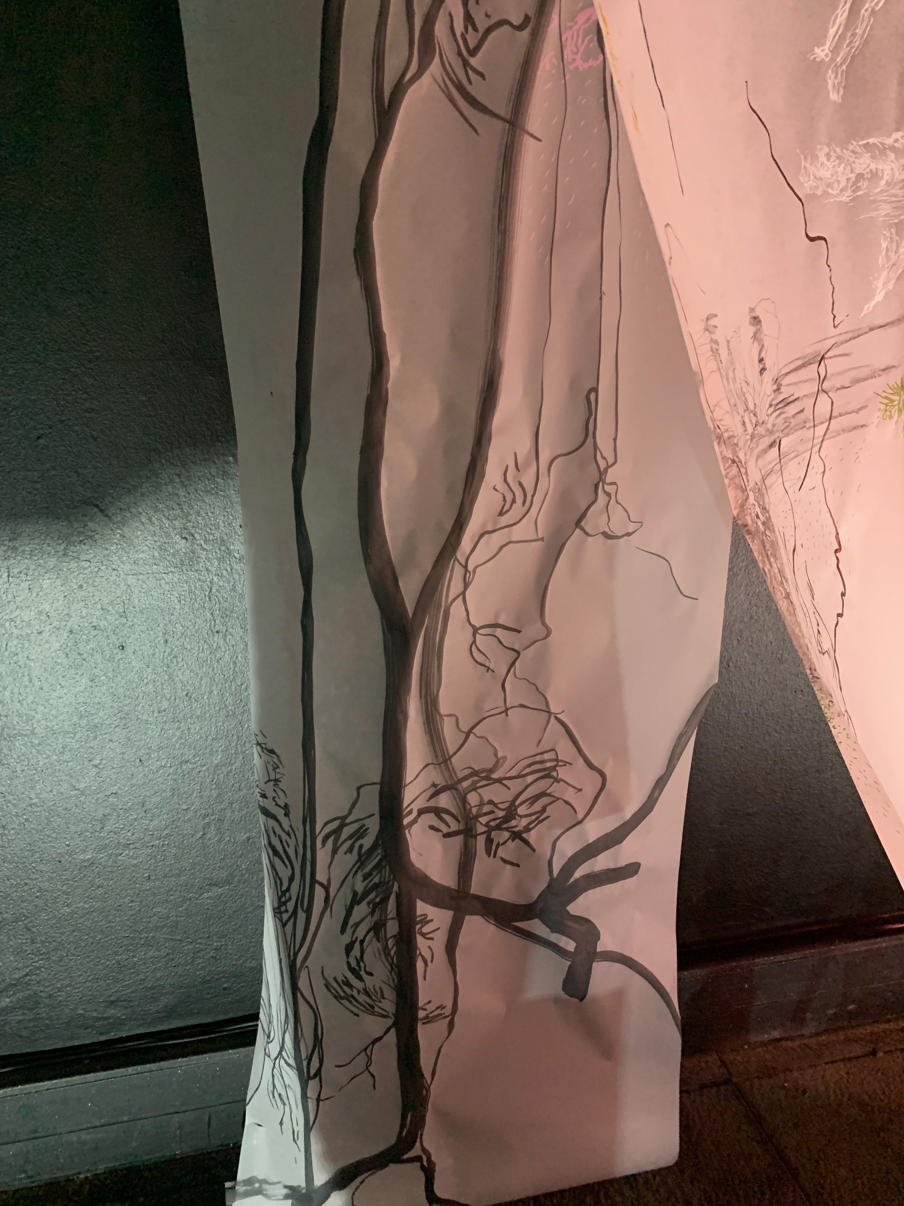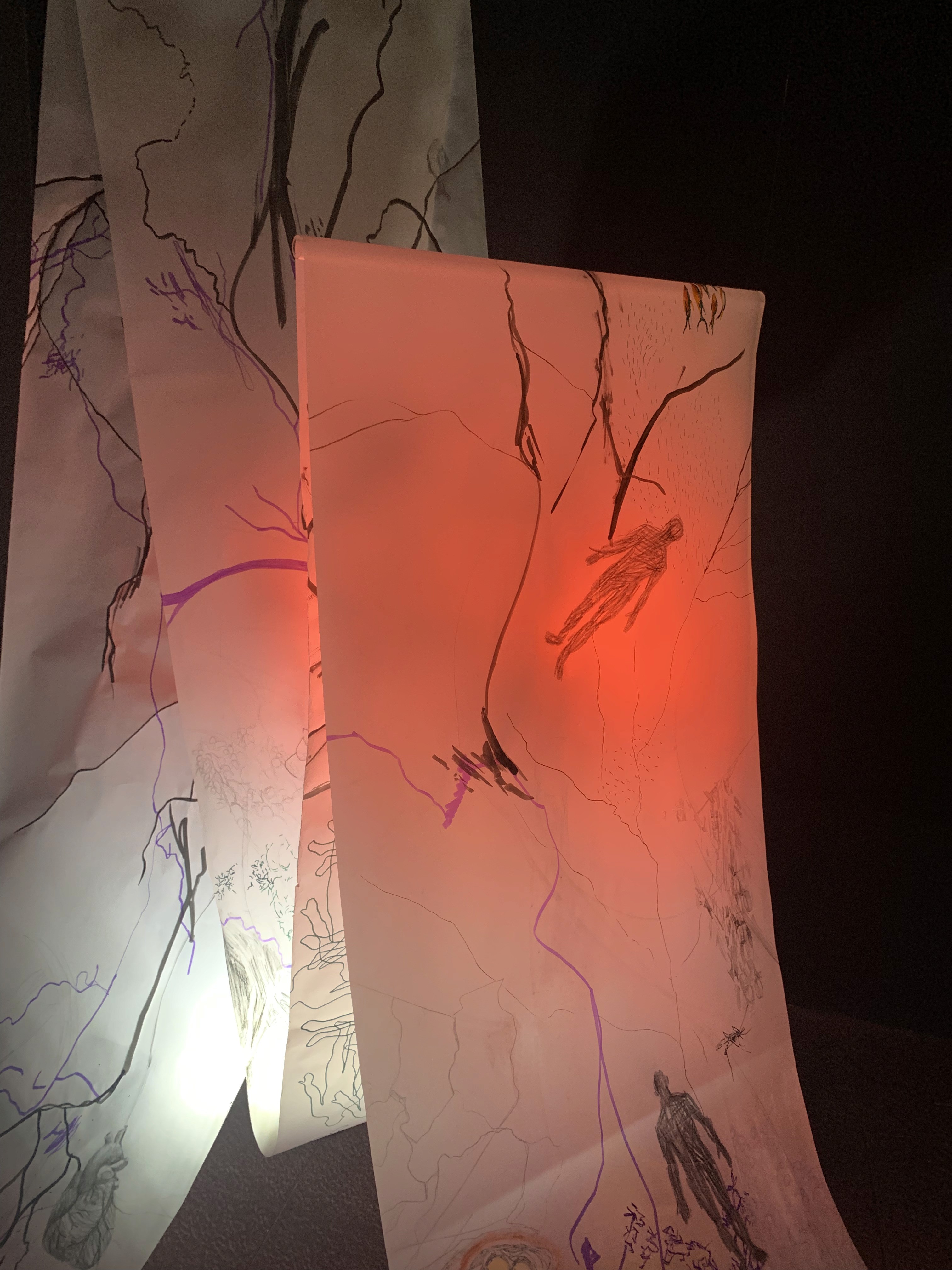The 68 kilo-meter long Juksei, runs through the poorest and wealthiest parts of Johannesburg, is used for washing, ablutions, baptisms and recreation. I decided to create a drawing, with the scale of 1:2000m, mapping the social realities and cultural complexities of the Jukskei river. The length of the drawing is 34m. This was my first time working on such a large drawing. It took 6 months of drawing daily, to get to this length. I could only see 1.5m of the drawing, at a time, while working; the drawing literally unrolled, as the months passed. I used semi-transparent paper, and worked on both sides, to visually represent the process of reflecting, looking below the surface, to understand the complex dynamics and significance of the river, and the impact of humans on the ecosystem. The time and scale afforded me a chance to experiment with materials, symbolism, complexity, space, scale changes and repetition. The drawing is a portrait of sorts; homage and lamentation. I wanted it to be crazy: big, beautiful and glowing, but also horrific, not shying away from the floating pollution, and dead bodies that have been found there. I shared images and videos of work in progress, with Gavin and Cameron who worked on the sonic component of the installation. After months of working together, I see conceptual, material and formal links between the drawing and the sonic elements.
