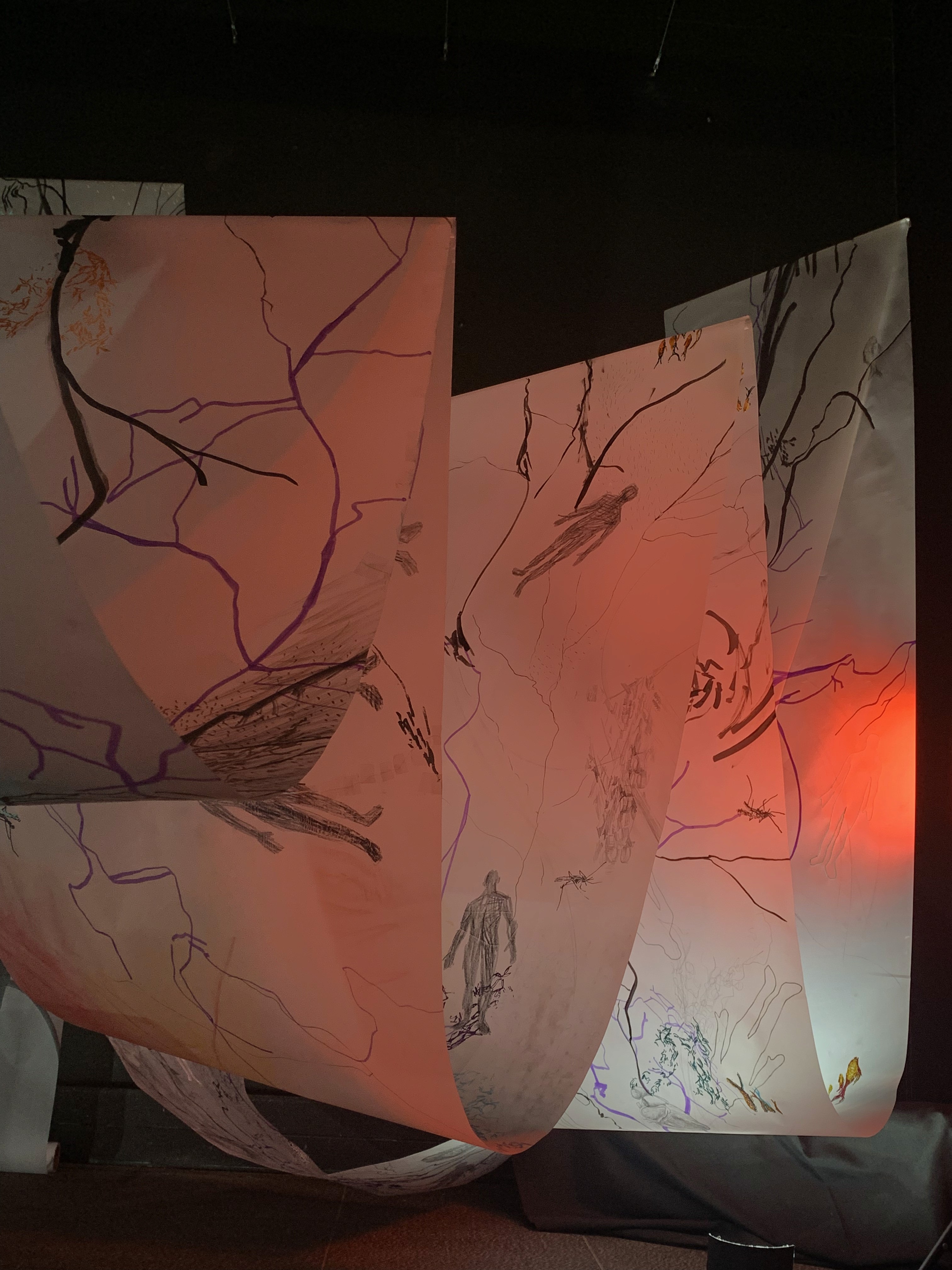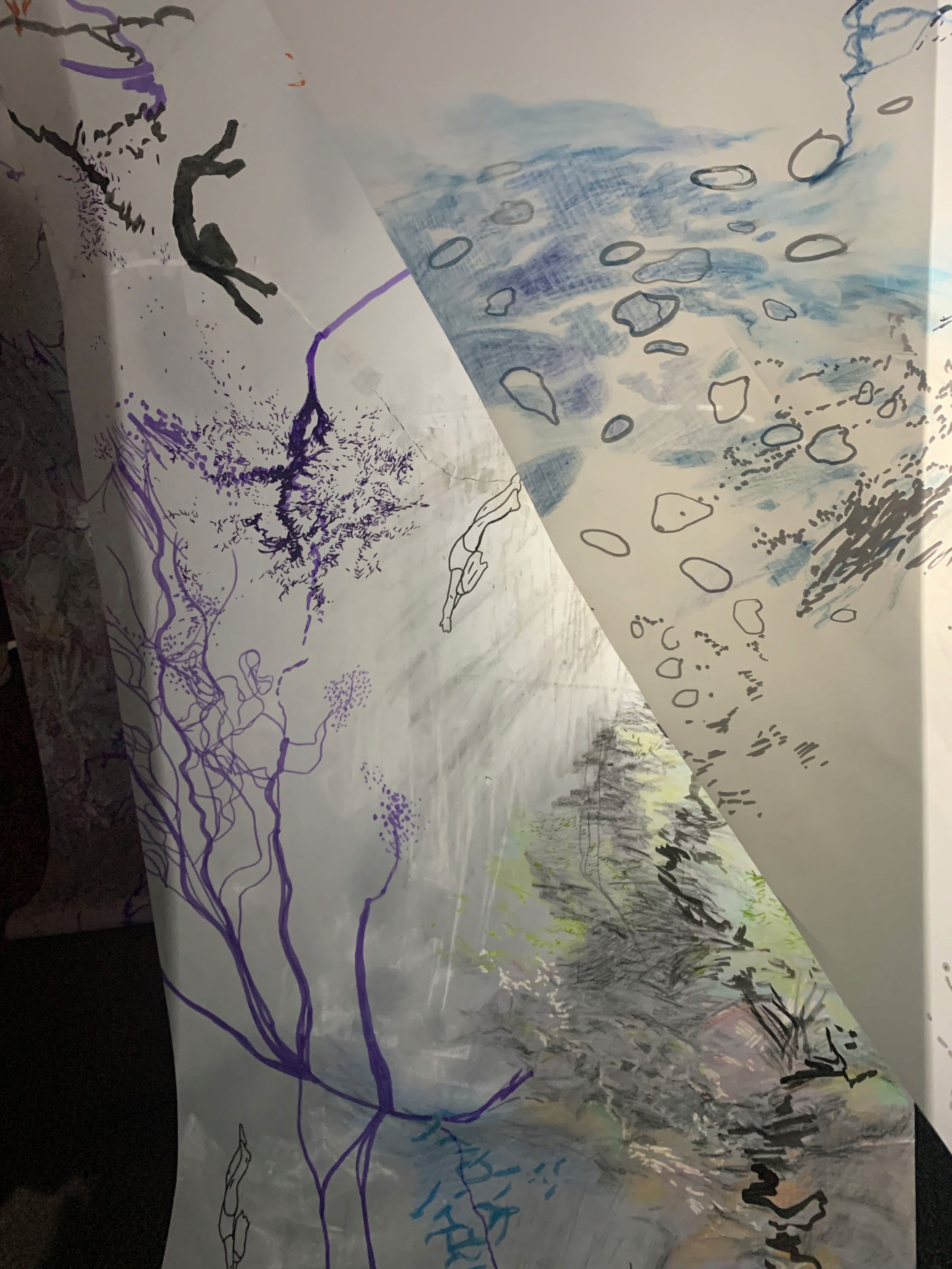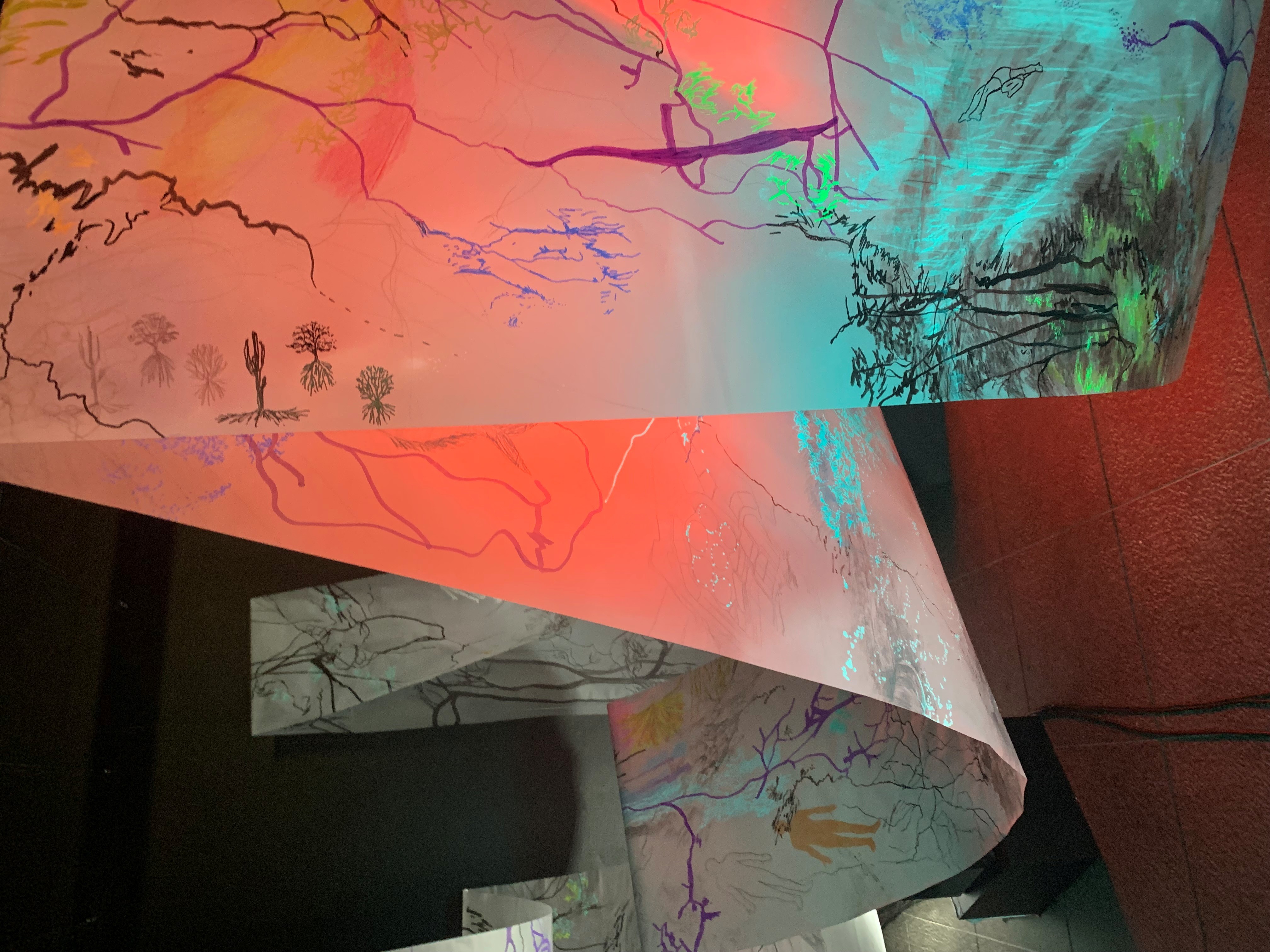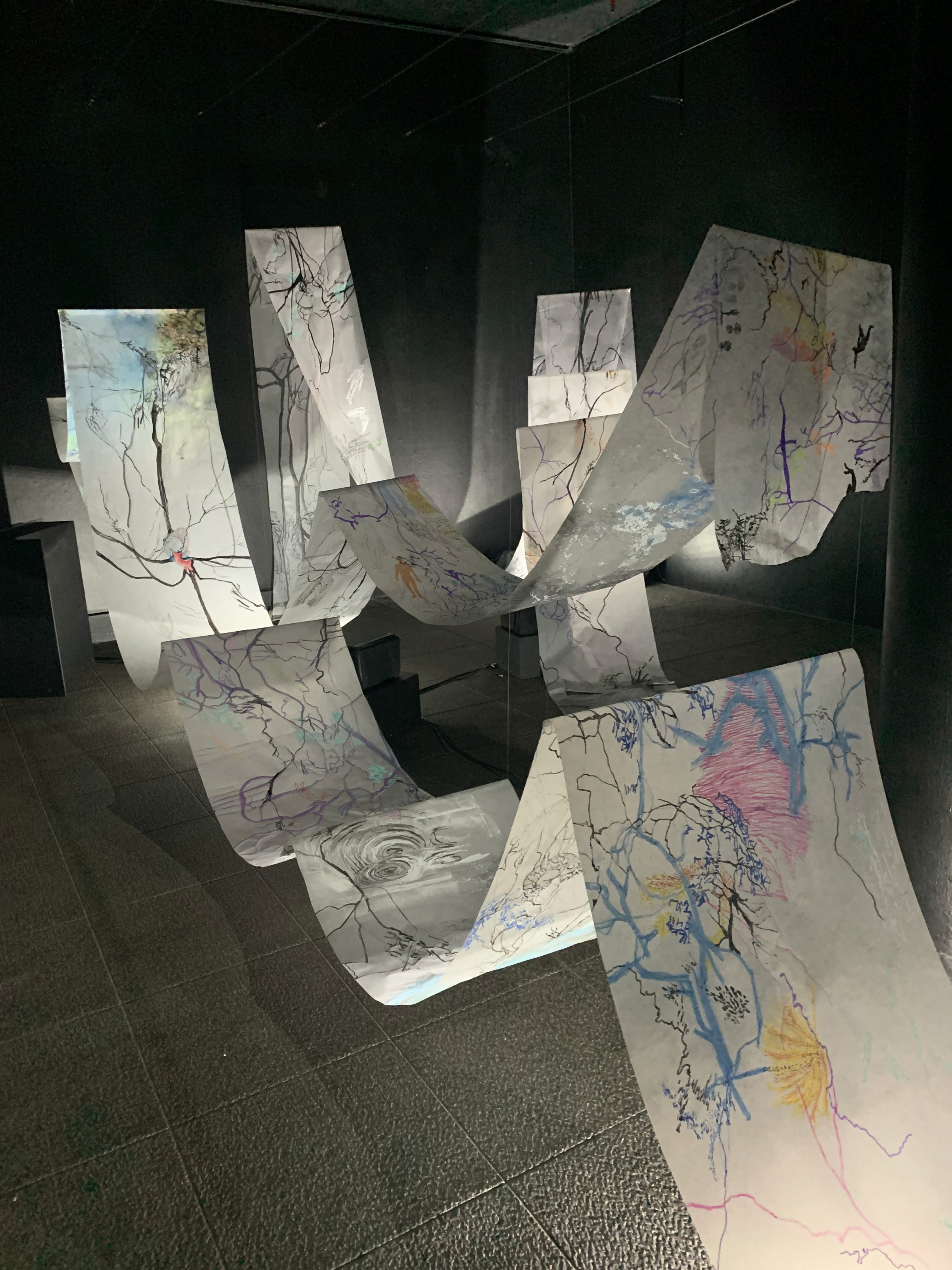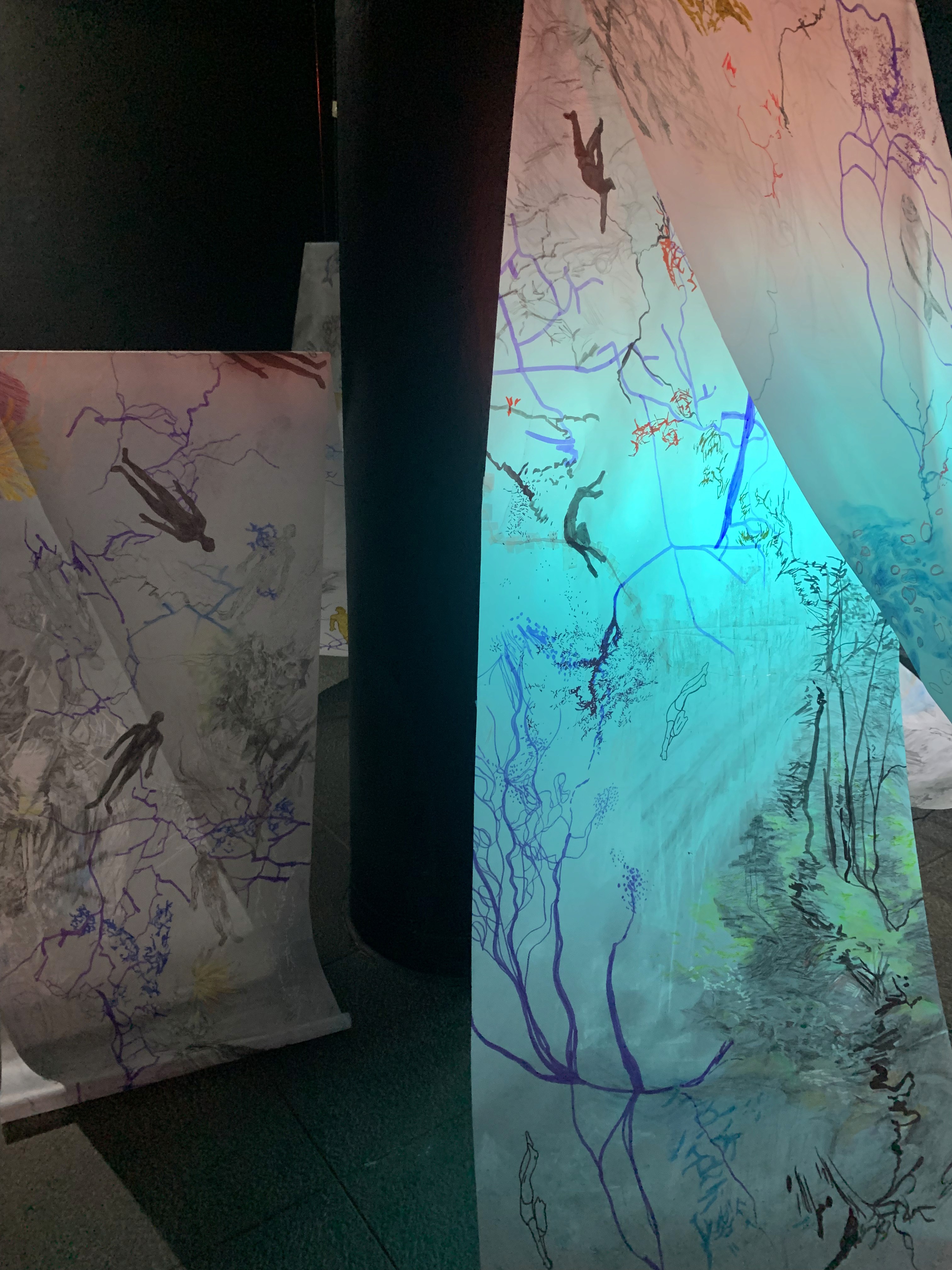 The 68 kilo-meter long Juksei, runs through the poorest and wealthiest parts of Johannesburg, is used for washing, ablutions, baptisms and recreation. I decided to create a drawing, with the scale of 1:2000m, mapping the social realities and cultural complexities of the Jukskei river. The length of the drawing is 34m. This was my first time working on such a large drawing. It took 6 months of drawing daily, to get to this length. I could only see 1.5m of the drawing, at a time, while working; the drawing literally unrolled, as the months passed. I used semi-transparent paper, and worked on both sides, to visually represent the process of reflecting, looking below the surface, to understand the complex dynamics and significance of the river, and the impact of humans on the ecosystem. The time and scale afforded me a chance to experiment with materials, symbolism, complexity, space, scale changes and repetition. The drawing is a portrait of sorts; homage and lamentation. I wanted it to be crazy: big, beautiful and glowing, but also horrific, not shying away from the floating pollution, and dead bodies that have been found there. I shared images and videos of work in progress, with Gavin and Cameron who worked on the sonic component of the installation. After months of working together, I see conceptual, material and formal links between the drawing and the sonic elements.