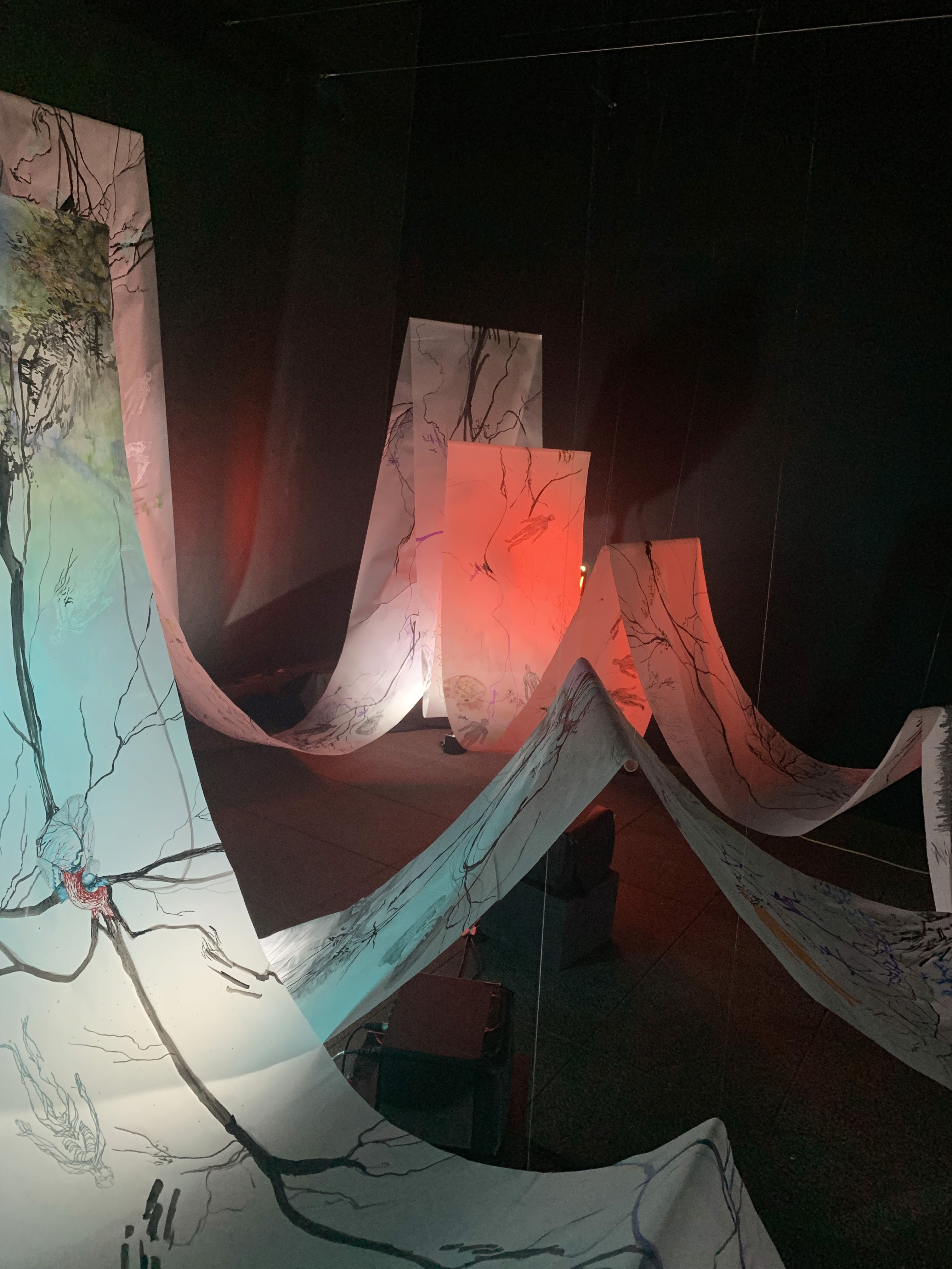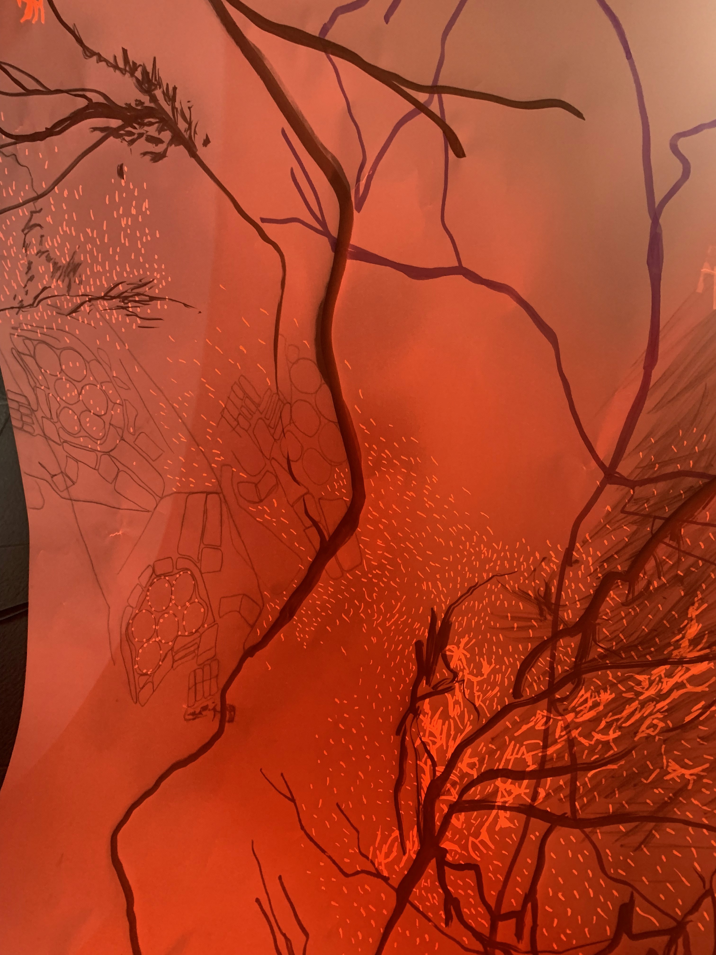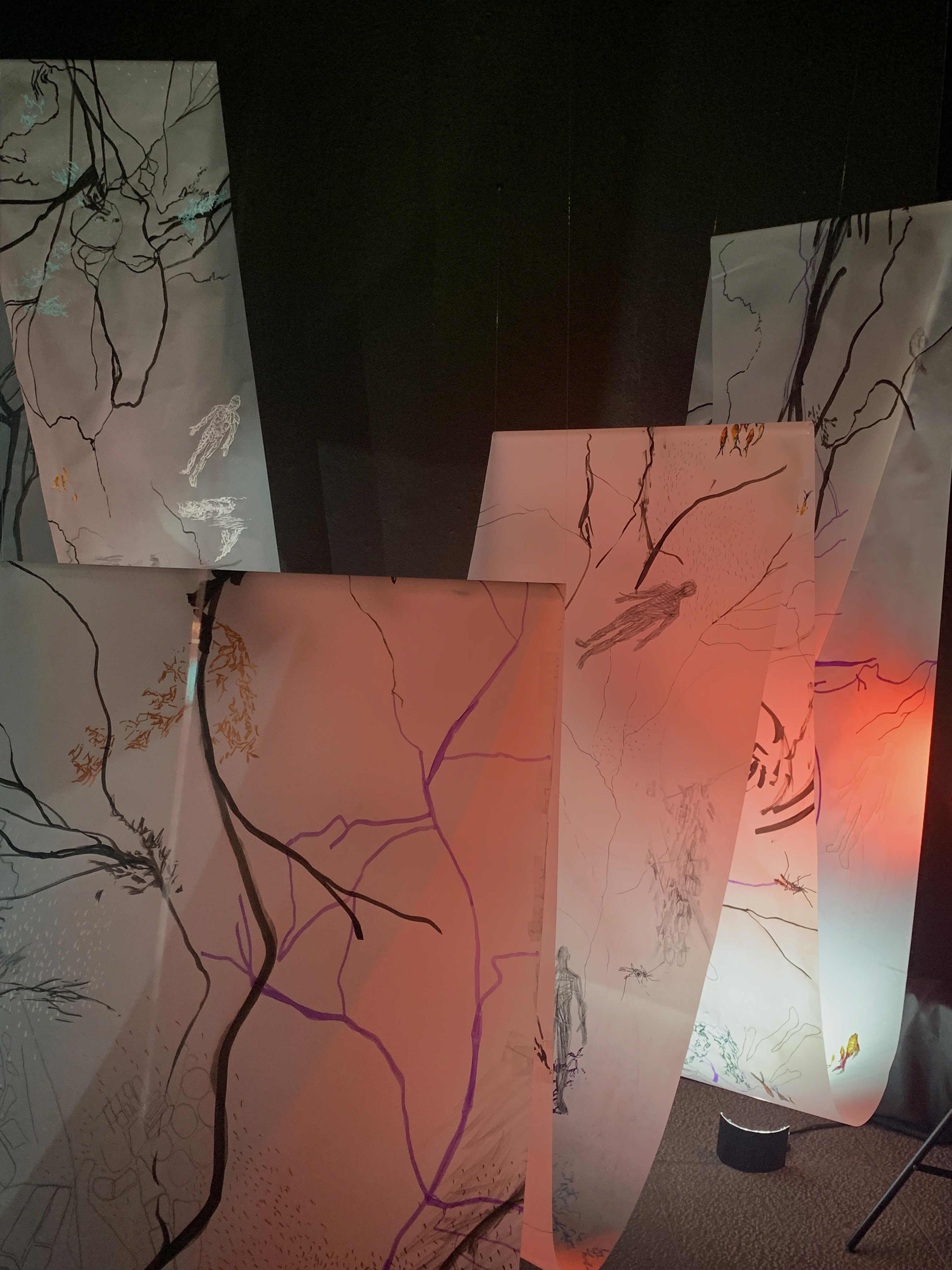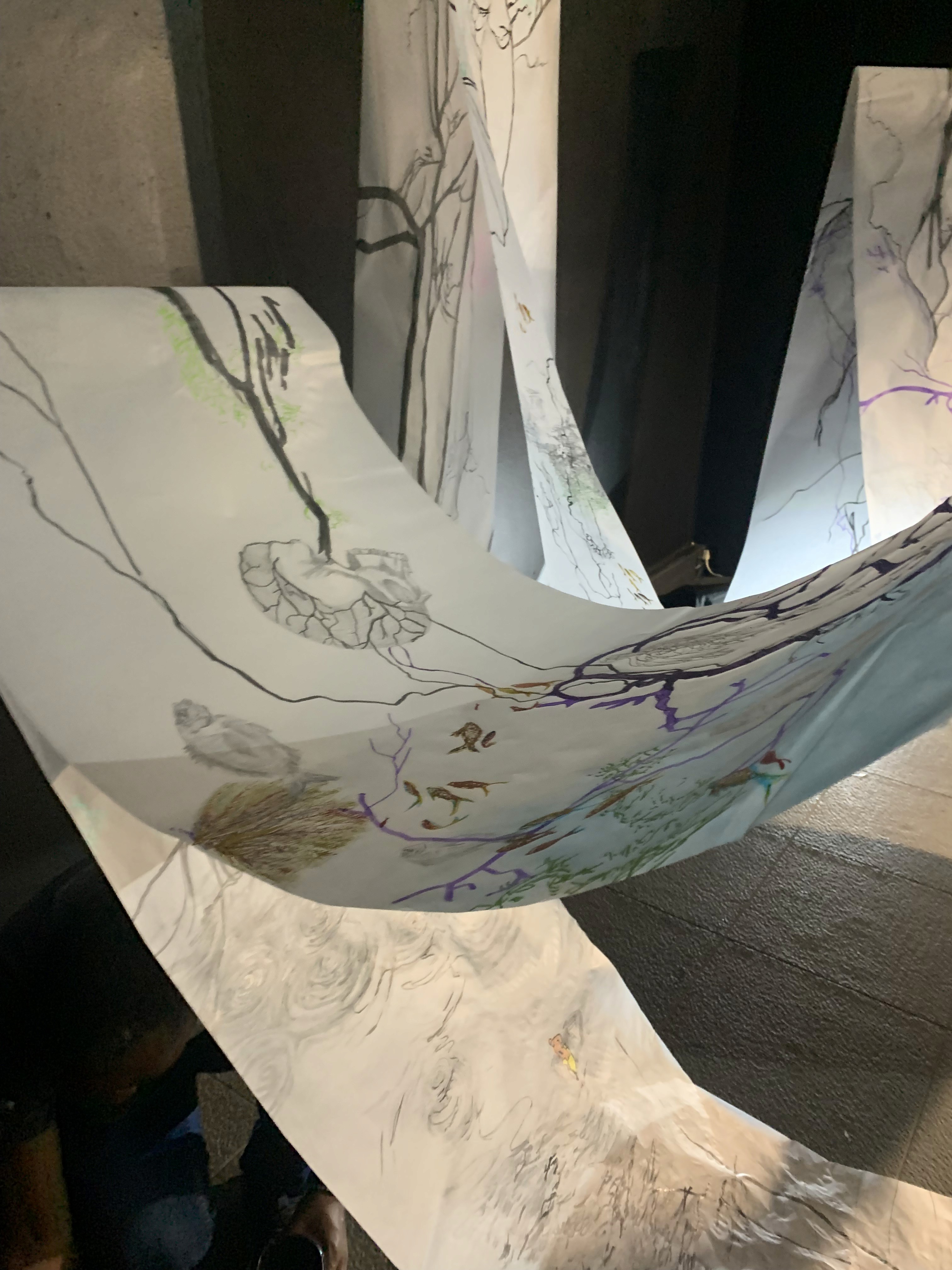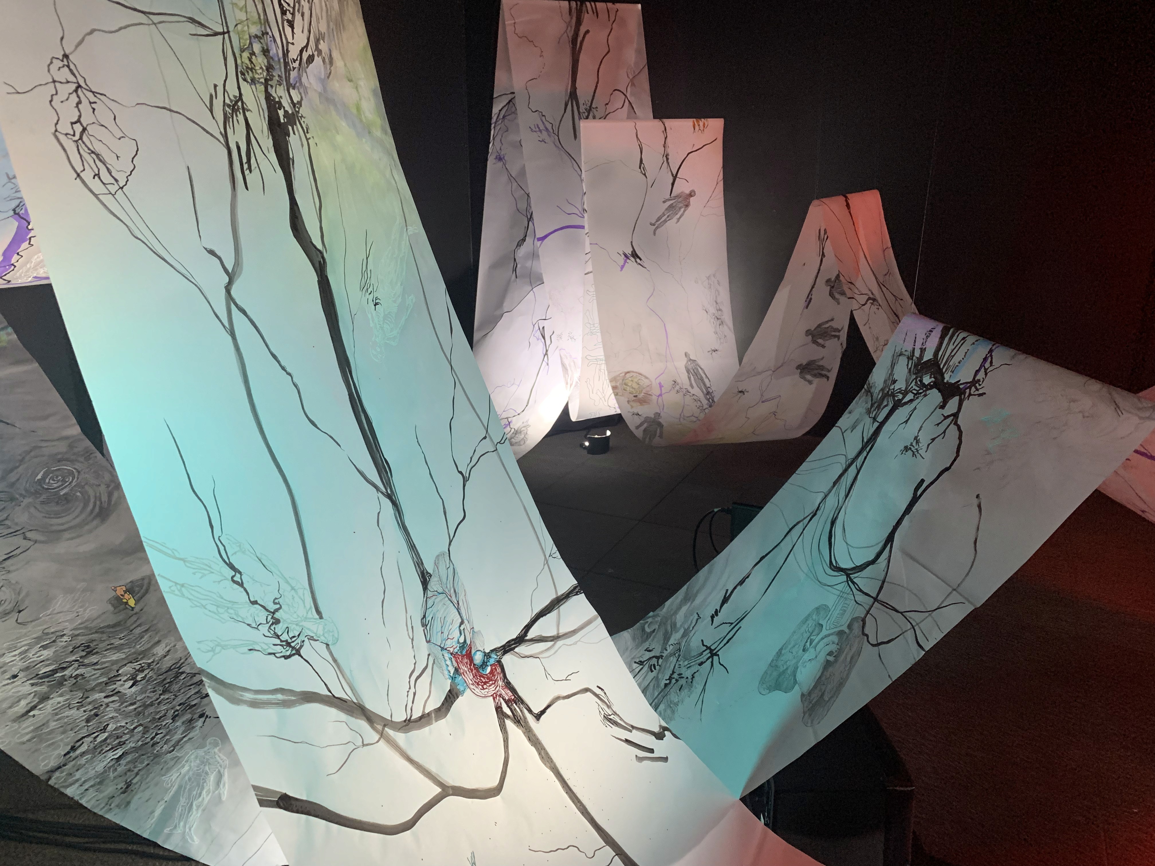 The 68 kilo-meter long Juksei, runs through the poorest and wealthiest parts of Johannesburg, is used for washing, ablutions, baptisms and recreation. I decided to create a drawing, with the scale of 1:2000m, mapping the social realities and cultural complexities of the Jukskei river. The length of the drawing is 34m. This was my first time working on such a large drawing. It took 6 months of drawing daily, to get to this length. I could only see 1.5m of the drawing, at a time, while working; the drawing literally unrolled, as the months passed. I used semi-transparent paper, and worked on both sides, to visually represent the process of reflecting, looking below the surface, to understand the complex dynamics and significance of the river, and the impact of humans on the ecosystem. The time and scale afforded me a chance to experiment with materials, symbolism, complexity, space, scale changes and repetition. The drawing is a portrait of sorts; homage and lamentation. I wanted it to be crazy: big, beautiful and glowing, but also horrific, not shying away from the floating pollution, and dead bodies that have been found there. I shared images and videos of work in progress, with Gavin and Cameron who worked on the sonic component of the installation. After months of working together, I see conceptual, material and formal links between the drawing and the sonic elements.