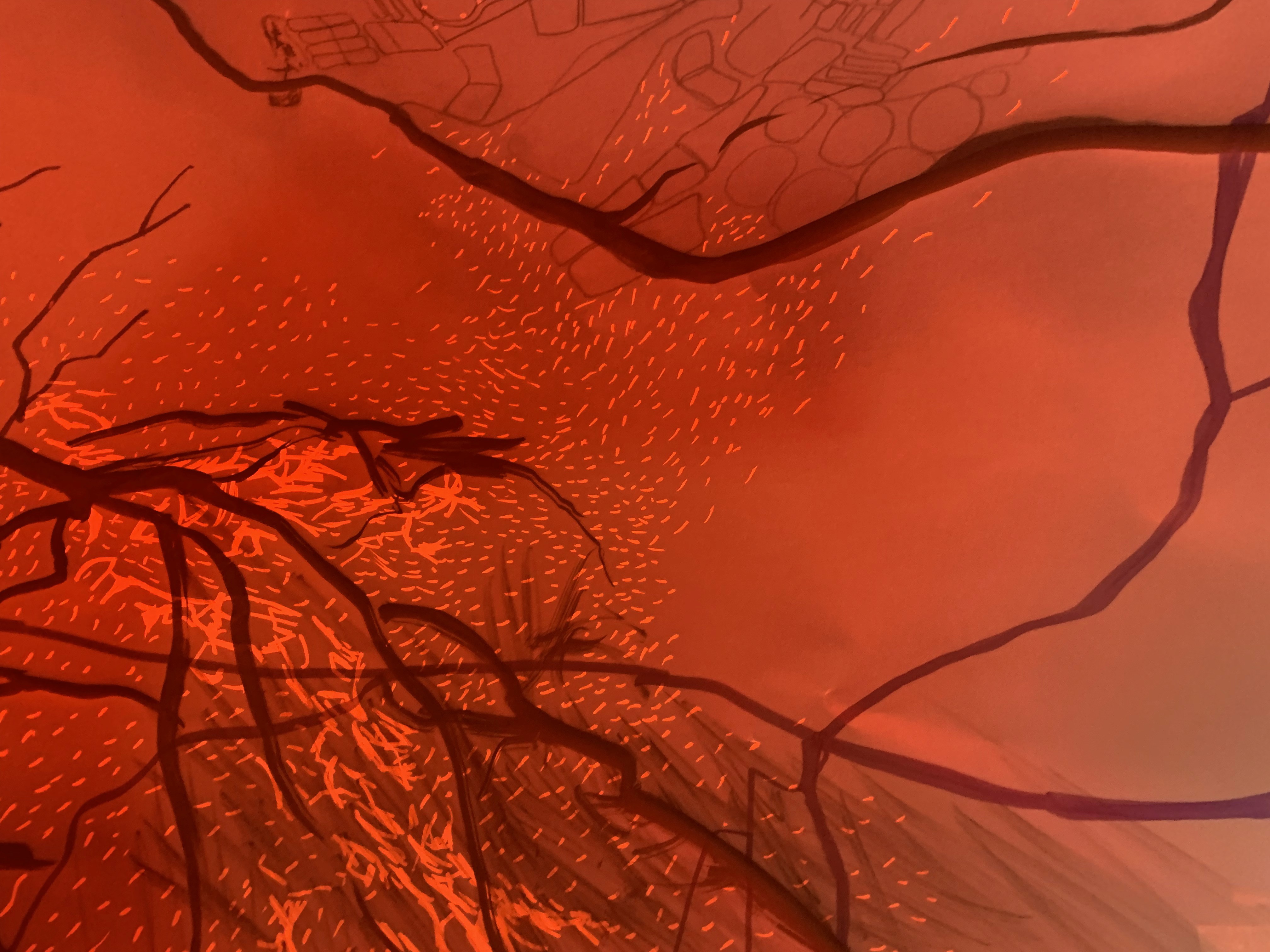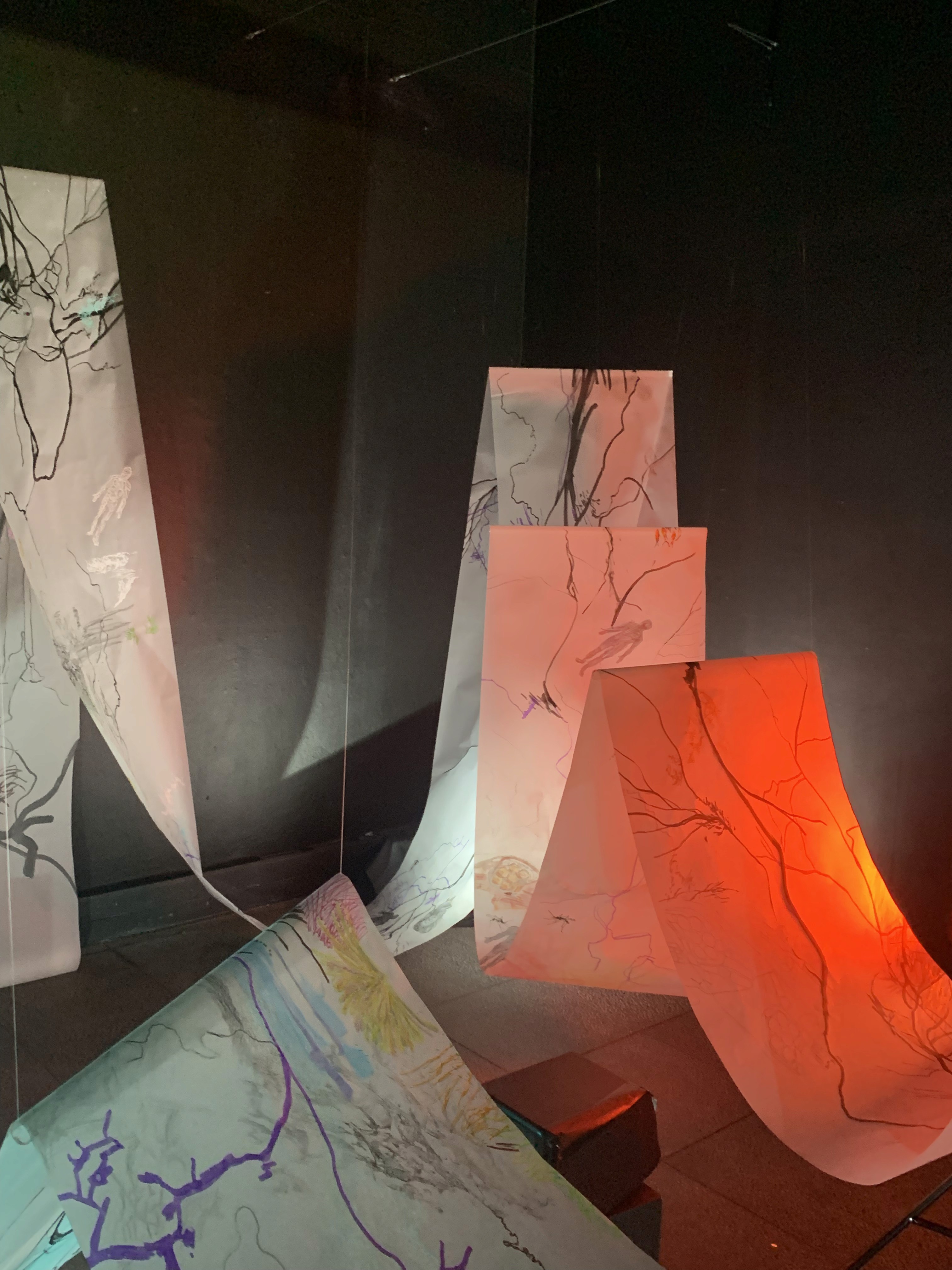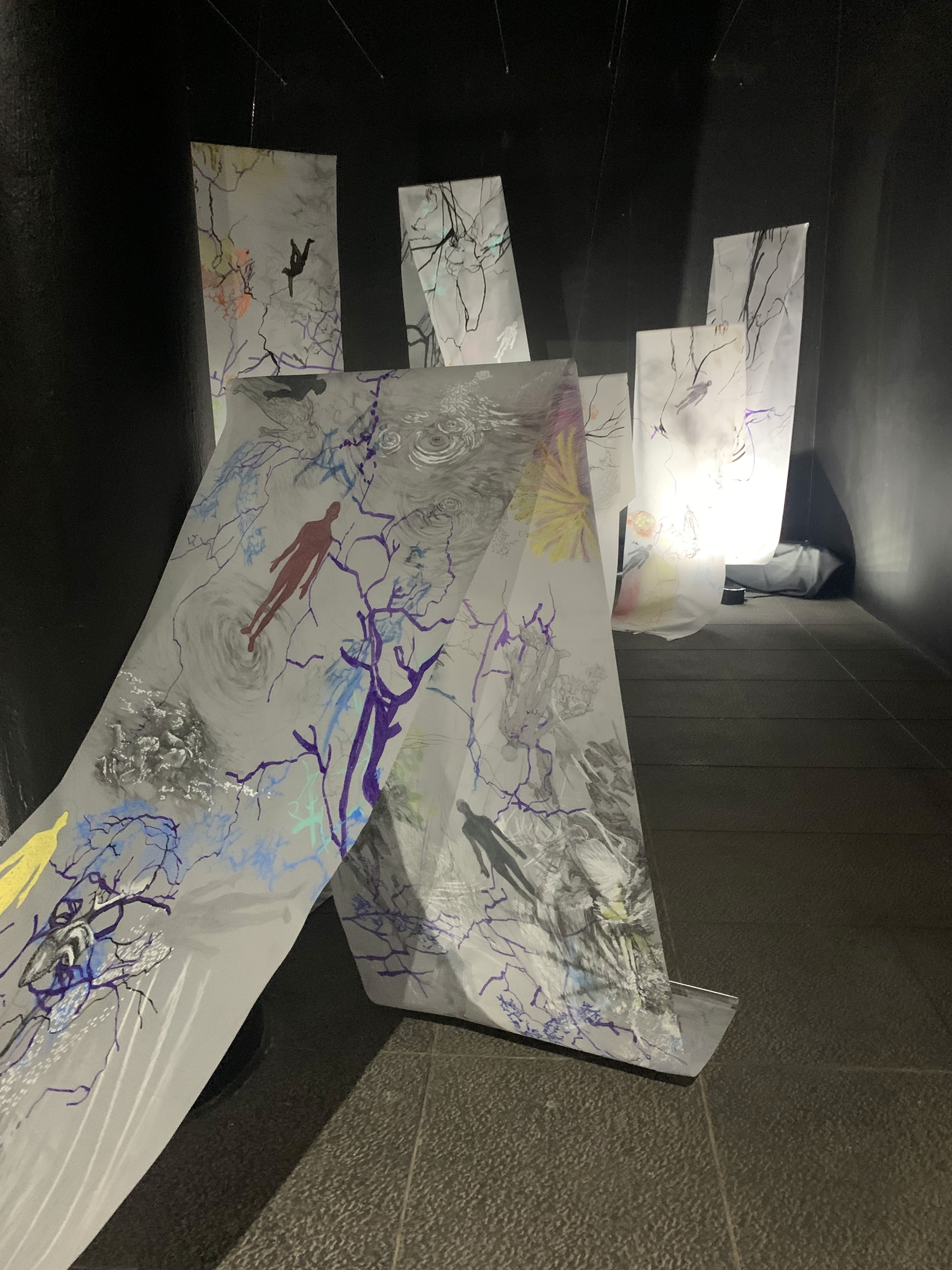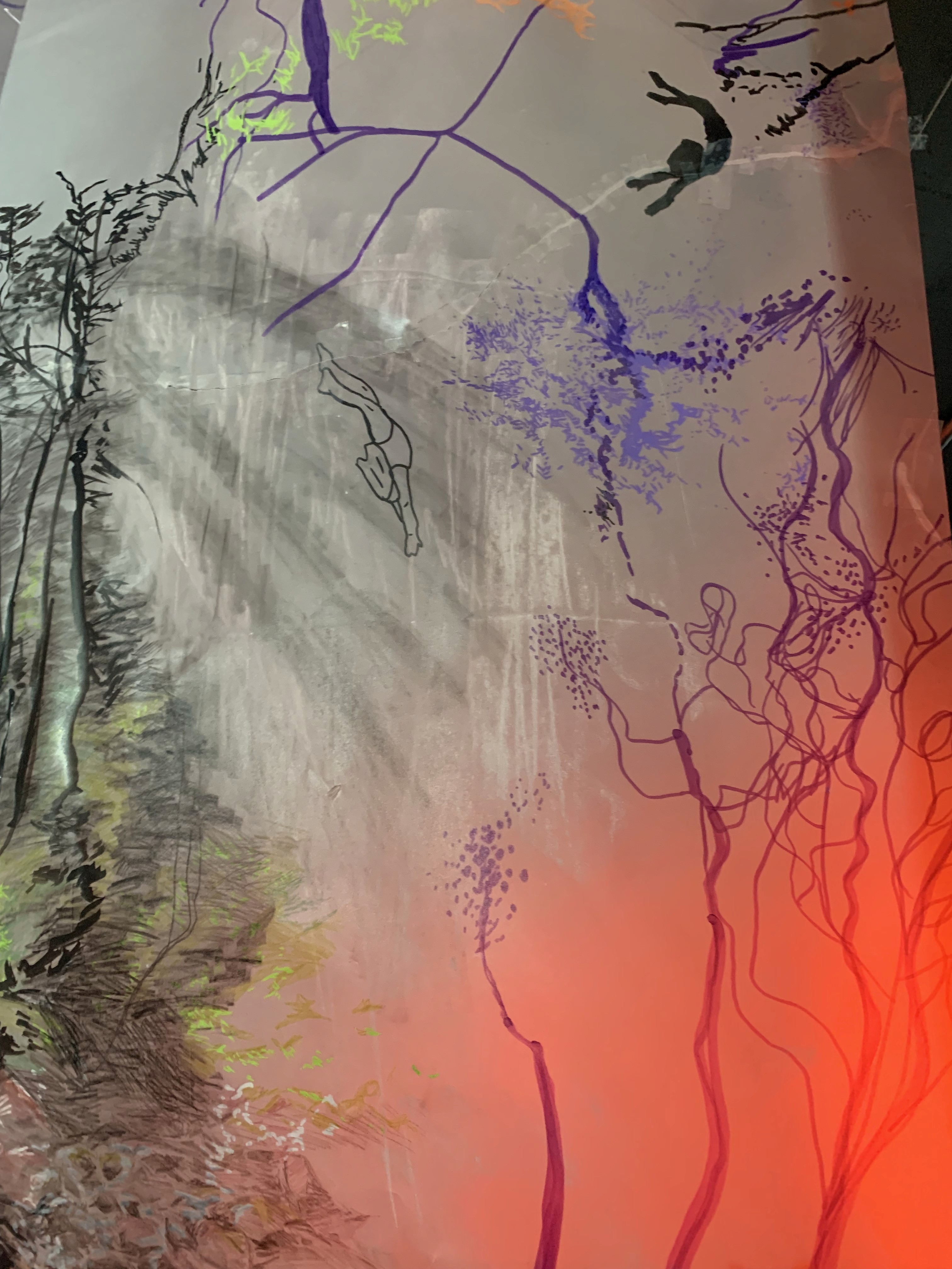 The 68 kilo-meter long Juksei, runs through the poorest and wealthiest parts of Johannesburg, is used for washing, ablutions, baptisms and recreation. I decided to create a drawing, with the scale of 1:2000m, mapping the social realities and cultural complexities of the Jukskei river. The length of the drawing is 34m. This was my first time working on such a large drawing. It took 6 months of drawing daily, to get to this length. I could only see 1.5m of the drawing, at a time, while working; the drawing literally unrolled, as the months passed. I used semi-transparent paper, and worked on both sides, to visually represent the process of reflecting, looking below the surface, to understand the complex dynamics and significance of the river, and the impact of humans on the ecosystem. The time and scale afforded me a chance to experiment with materials, symbolism, complexity, space, scale changes and repetition. The drawing is a portrait of sorts; homage and lamentation. I wanted it to be crazy: big, beautiful and glowing, but also horrific, not shying away from the floating pollution, and dead bodies that have been found there. I shared images and videos of work in progress, with Gavin and Cameron who worked on the sonic component of the installation. After months of working together, I see conceptual, material and formal links between the drawing and the sonic elements.