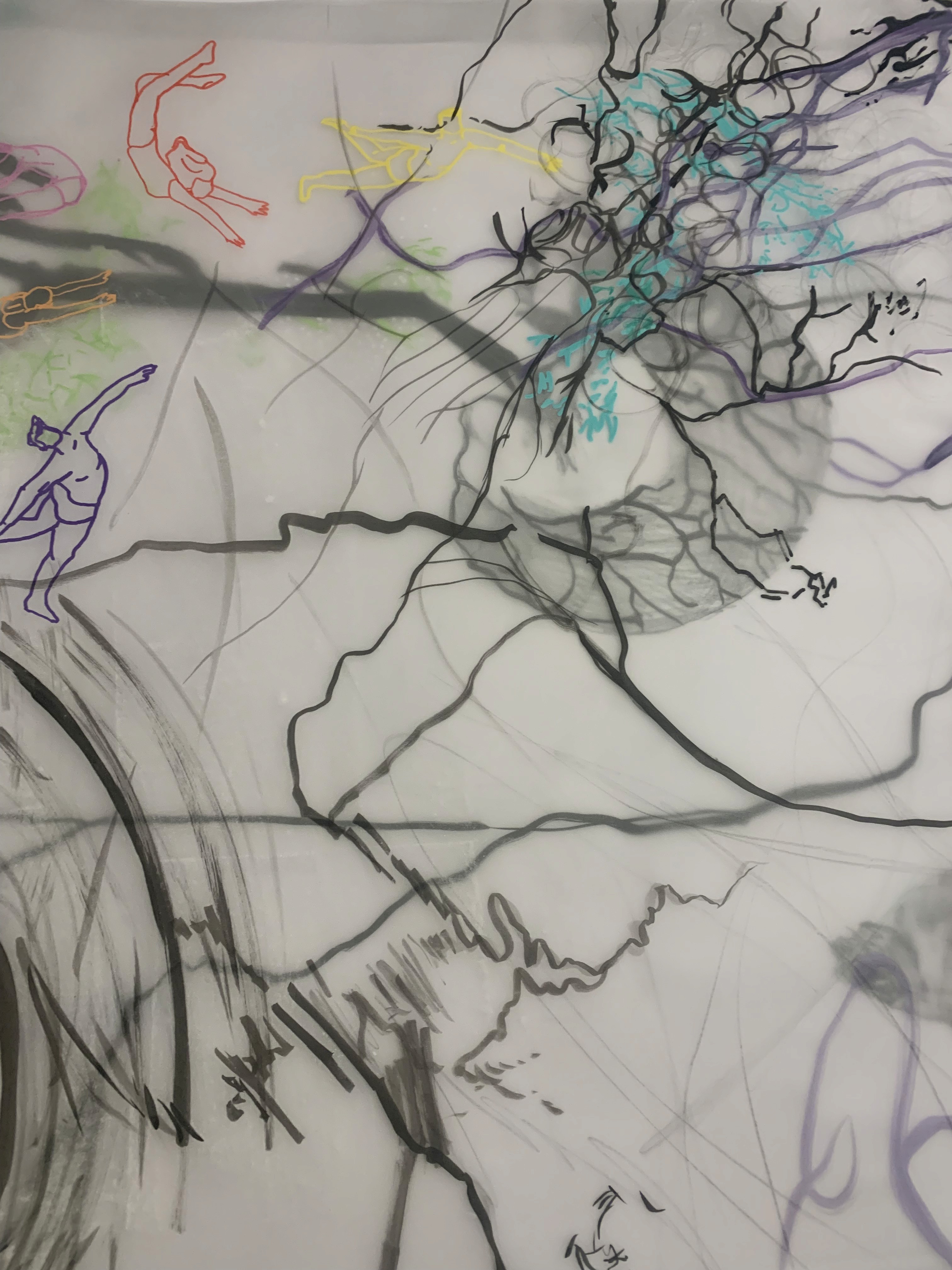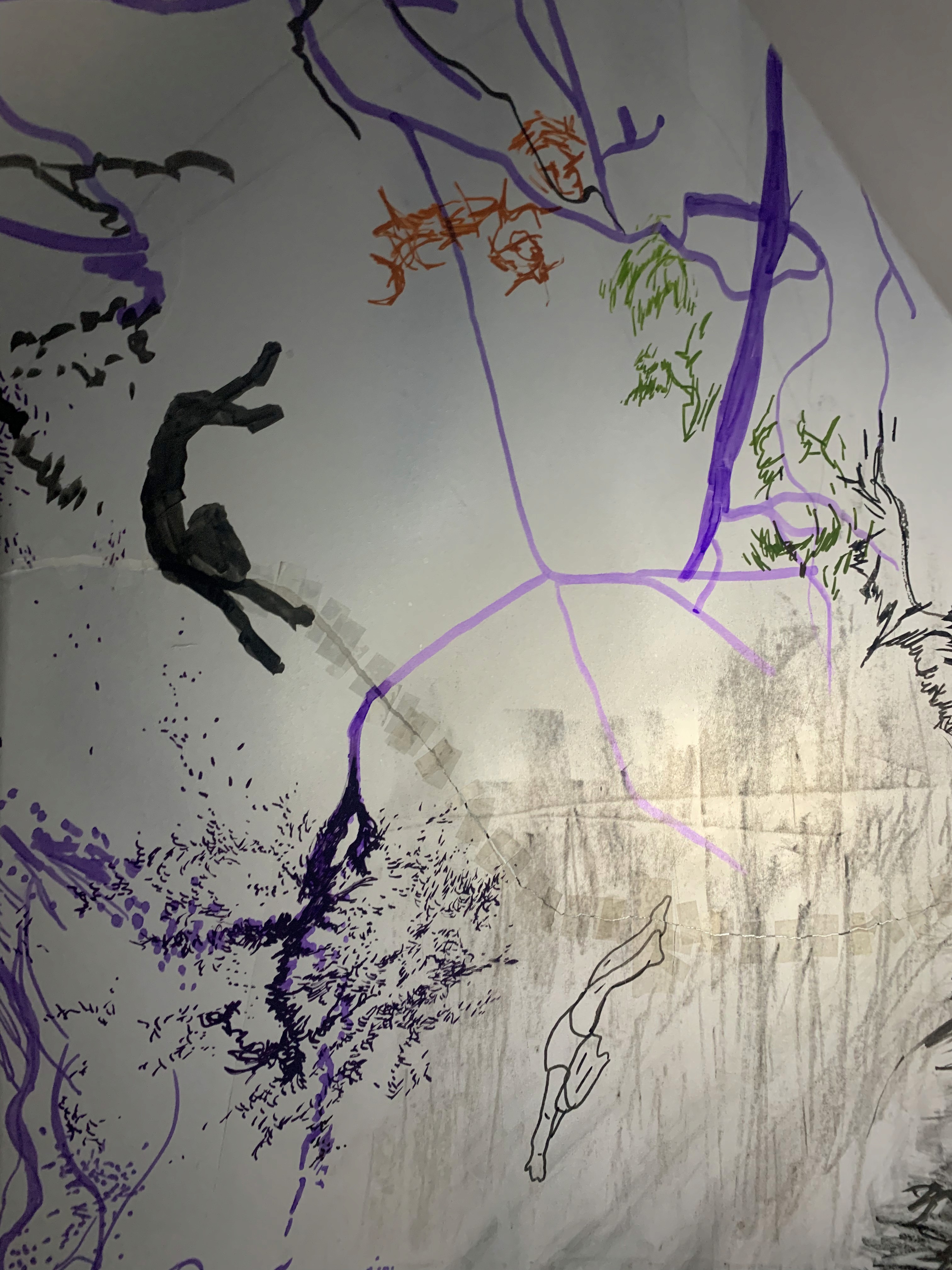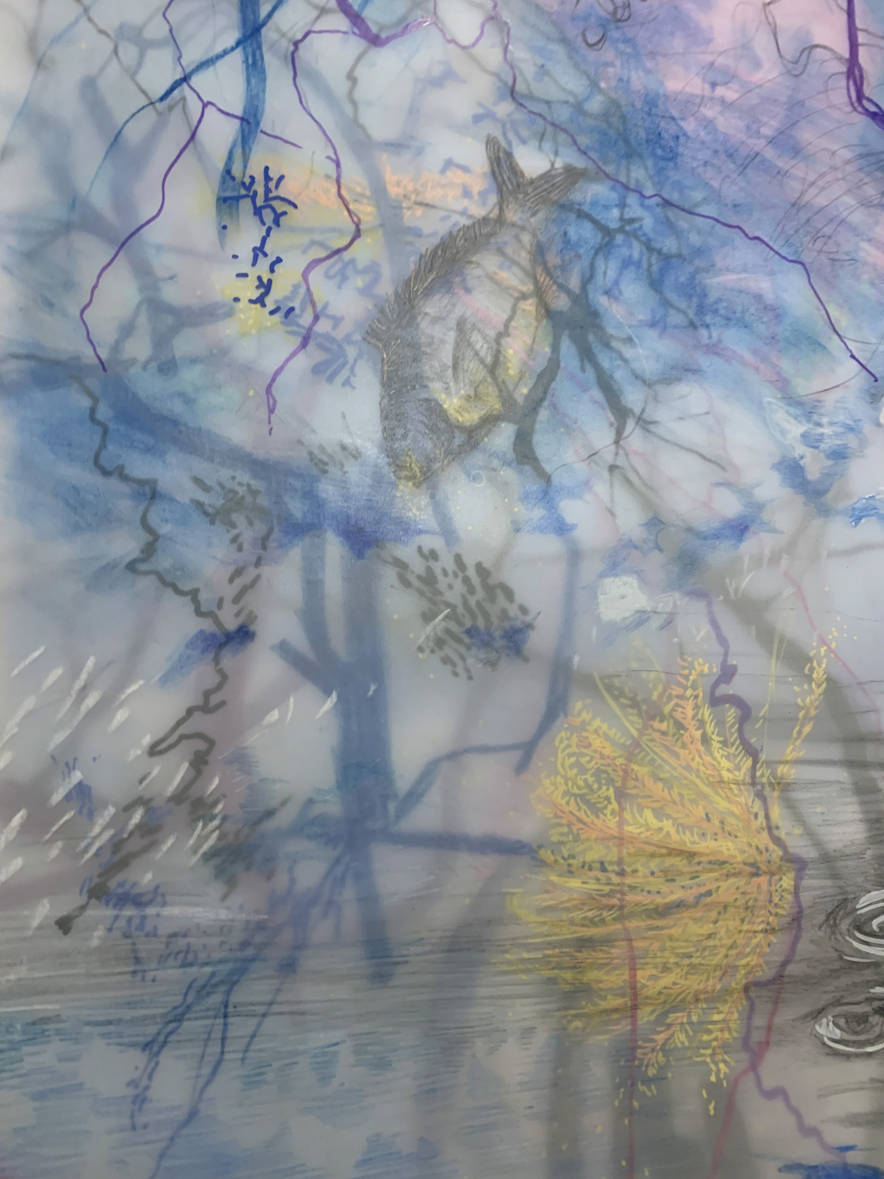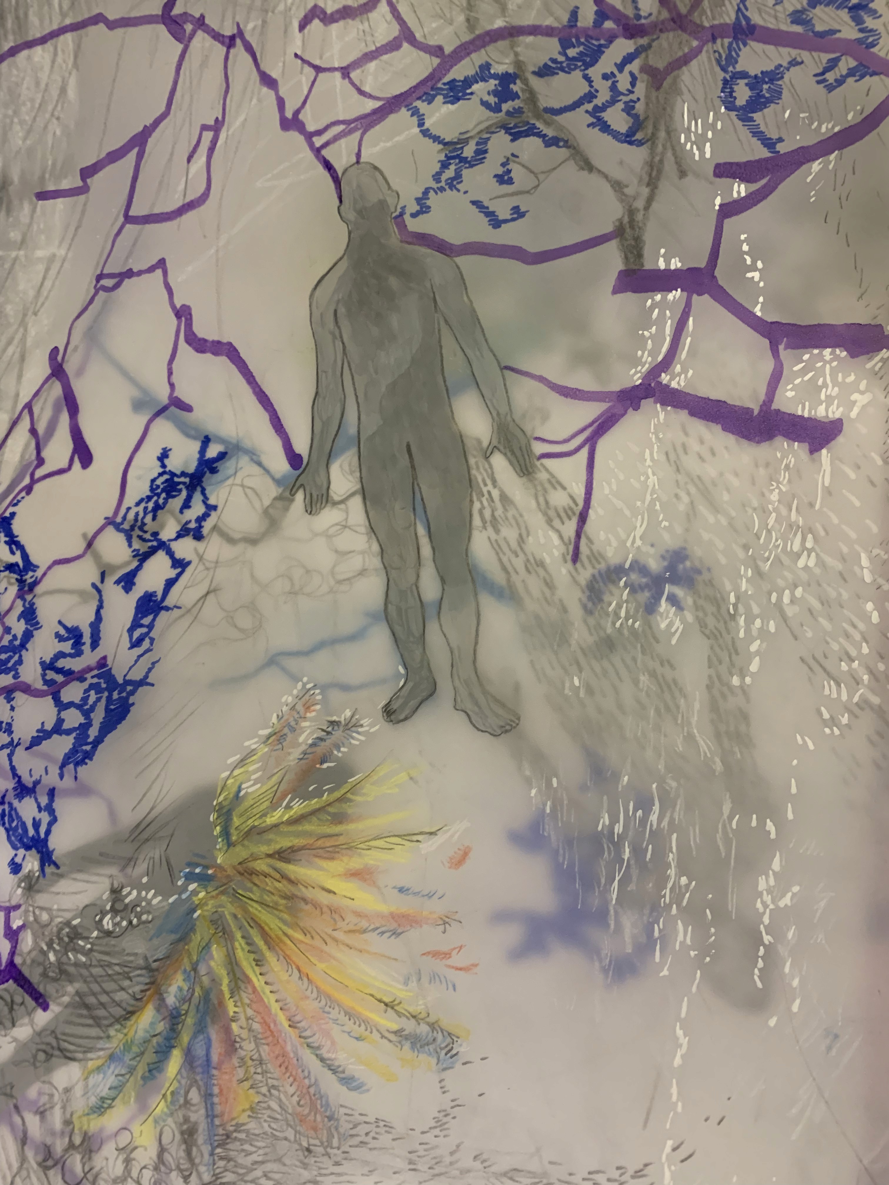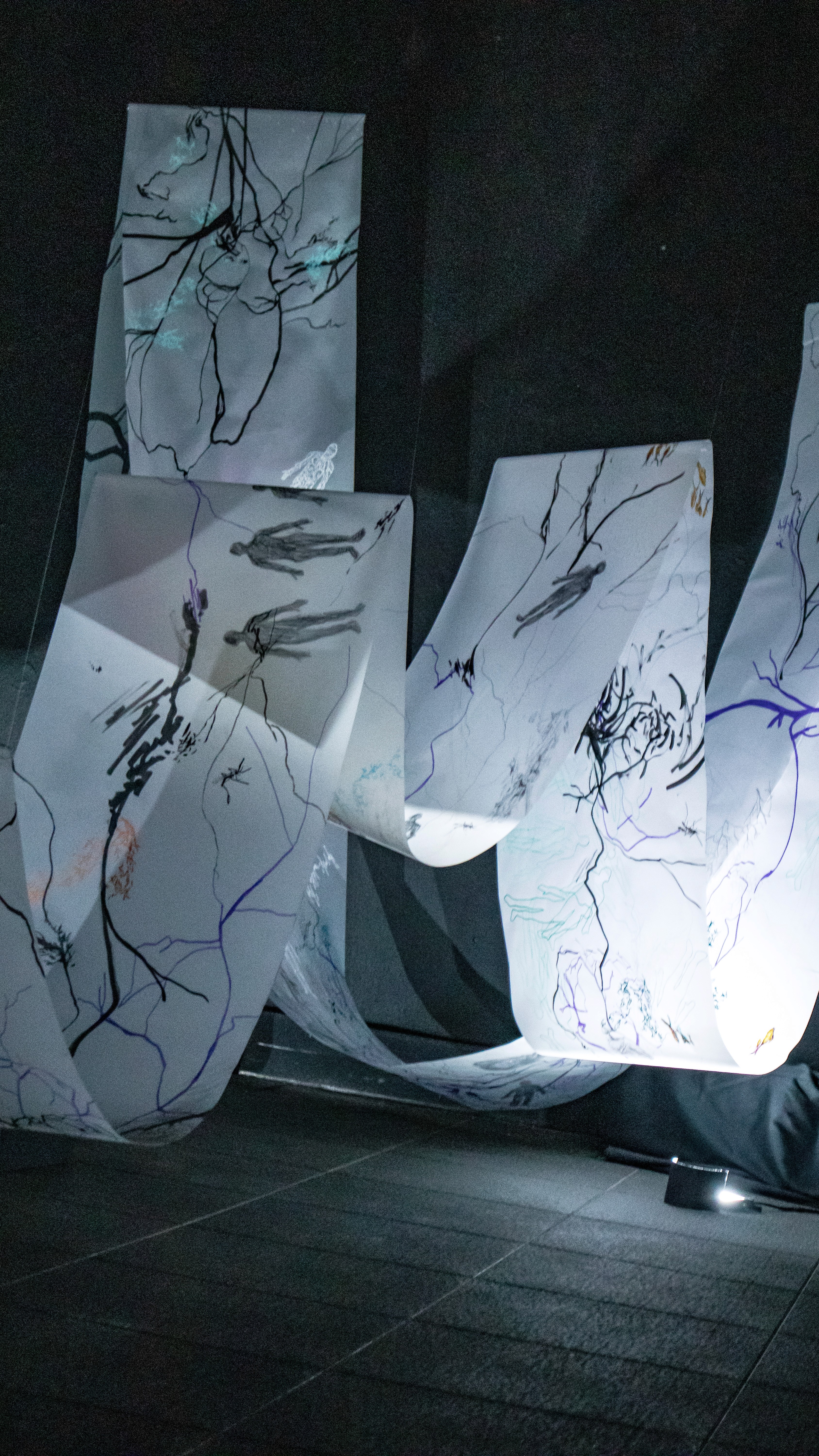 The 68 kilo-meter long Juksei, runs through the poorest and wealthiest parts of Johannesburg, is used for washing, ablutions, baptisms and recreation. I decided to create a drawing, with the scale of 1:2000m, mapping the social realities and cultural complexities of the Jukskei river. The length of the drawing is 34m. This was my first time working on such a large drawing. It took 6 months of drawing daily, to get to this length. I could only see 1.5m of the drawing, at a time, while working; the drawing literally unrolled, as the months passed. I used semi-transparent paper, and worked on both sides, to visually represent the process of reflecting, looking below the surface, to understand the complex dynamics and significance of the river, and the impact of humans on the ecosystem. The time and scale afforded me a chance to experiment with materials, symbolism, complexity, space, scale changes and repetition. The drawing is a portrait of sorts; homage and lamentation. I wanted it to be crazy: big, beautiful and glowing, but also horrific, not shying away from the floating pollution, and dead bodies that have been found there. I shared images and videos of work in progress, with Gavin and Cameron who worked on the sonic component of the installation. After months of working together, I see conceptual, material and formal links between the drawing and the sonic elements.