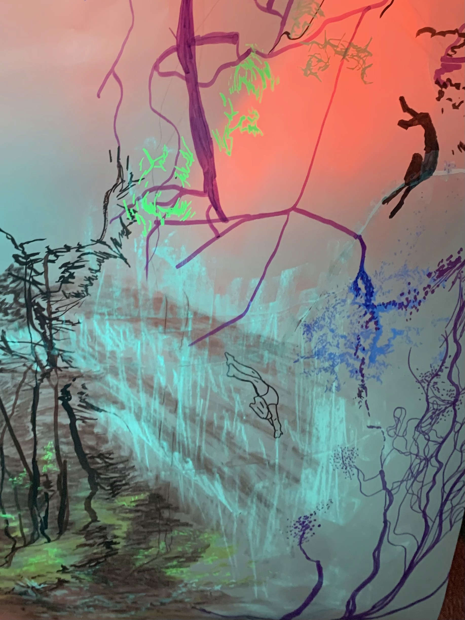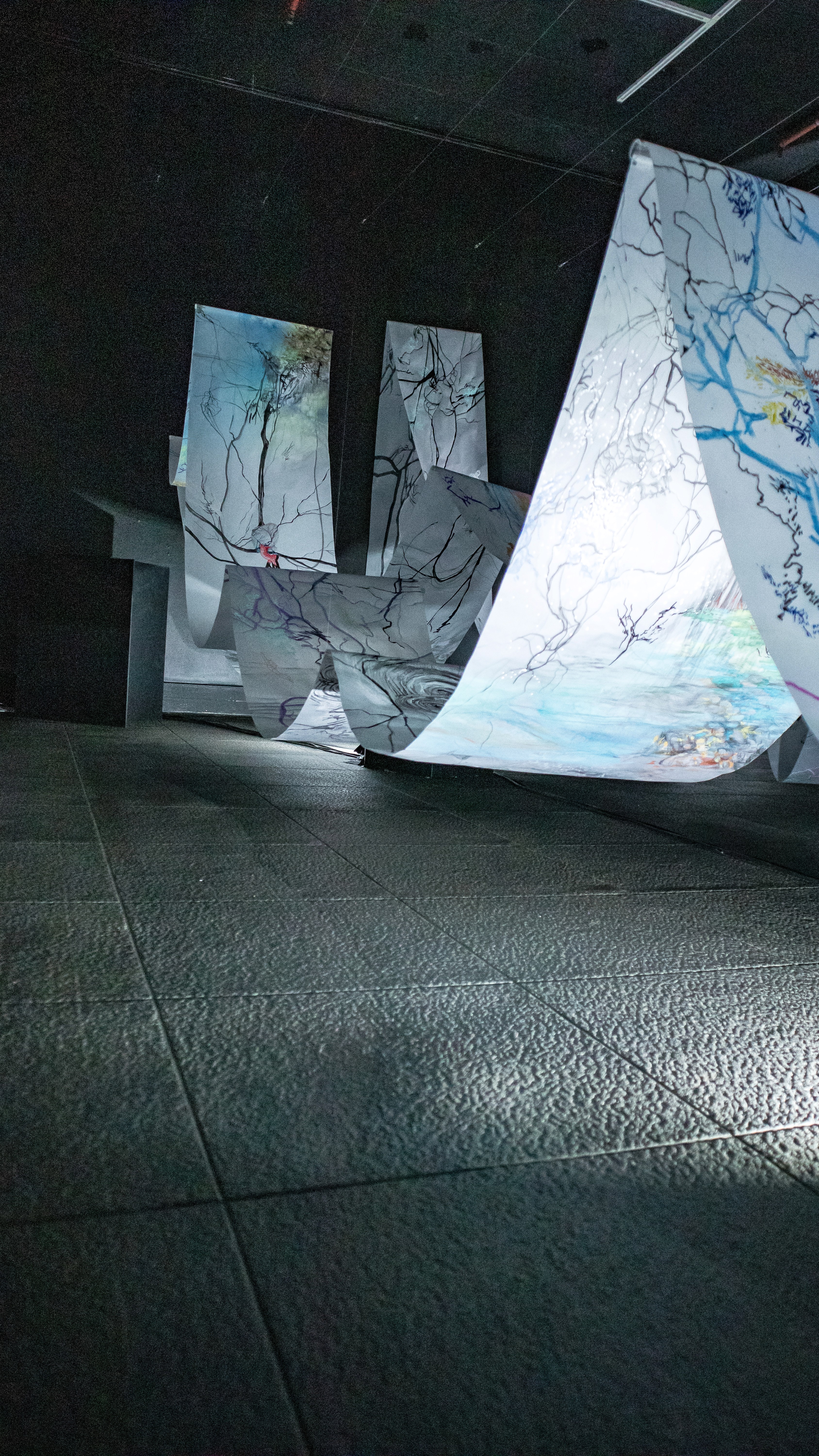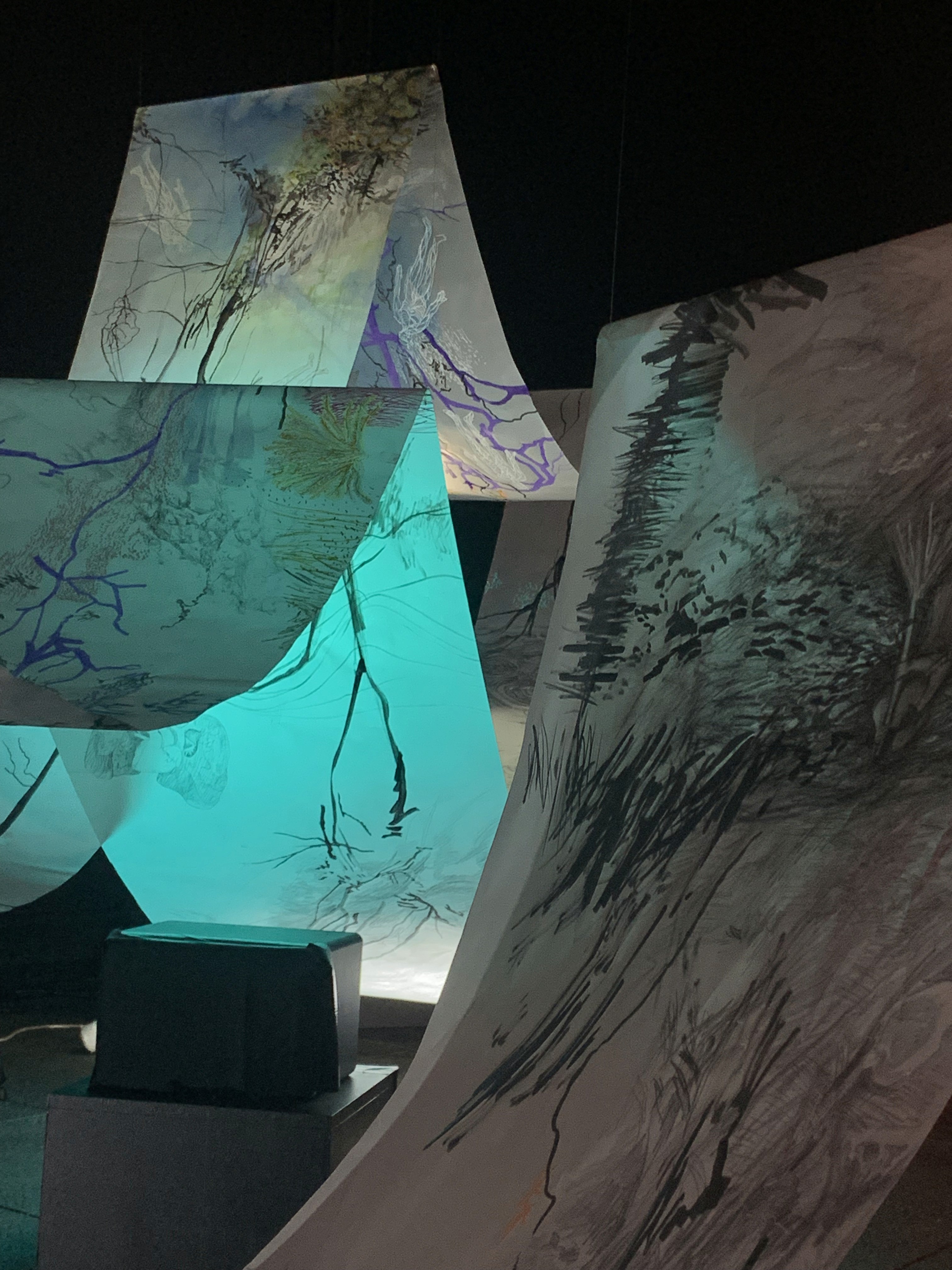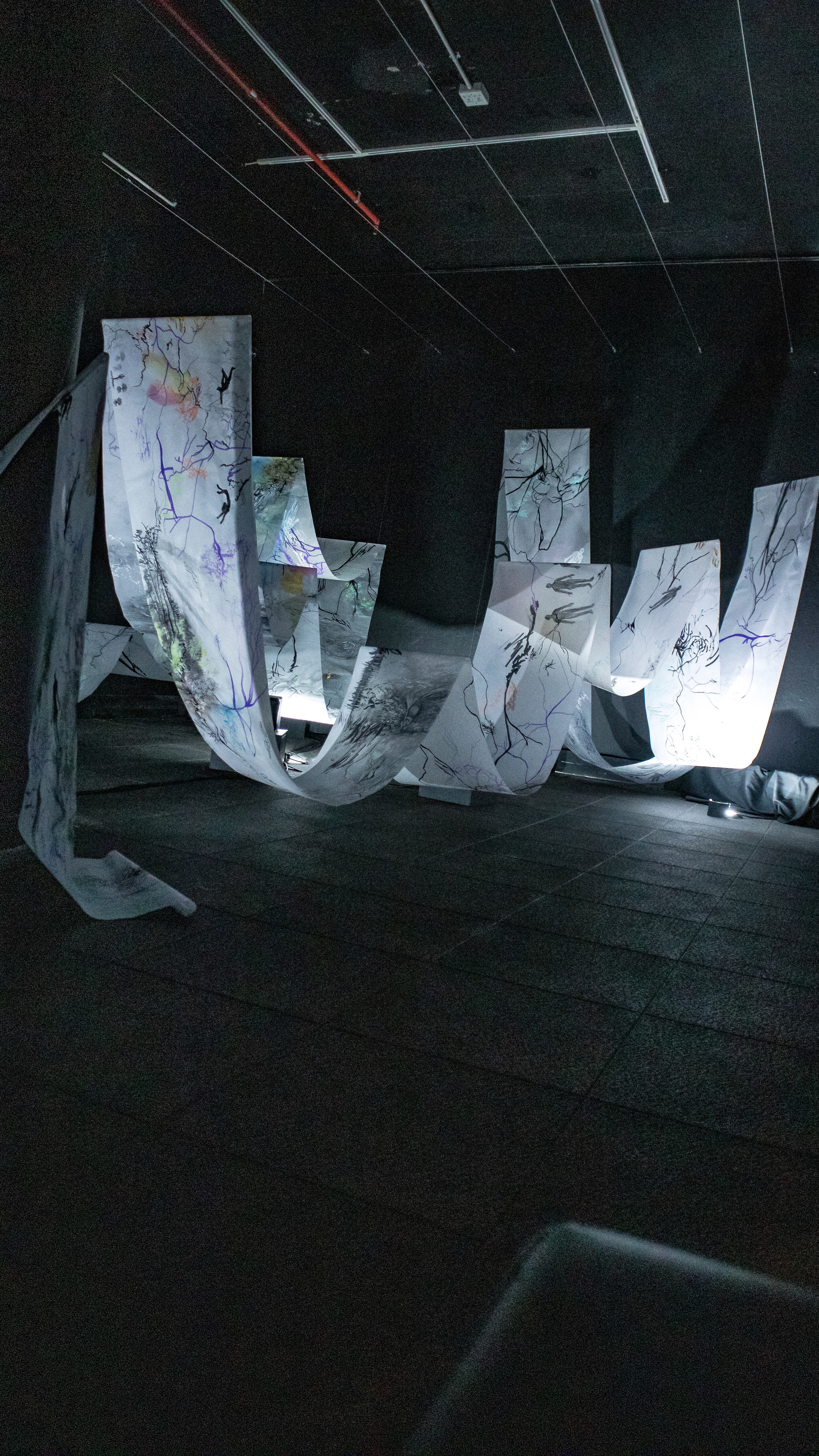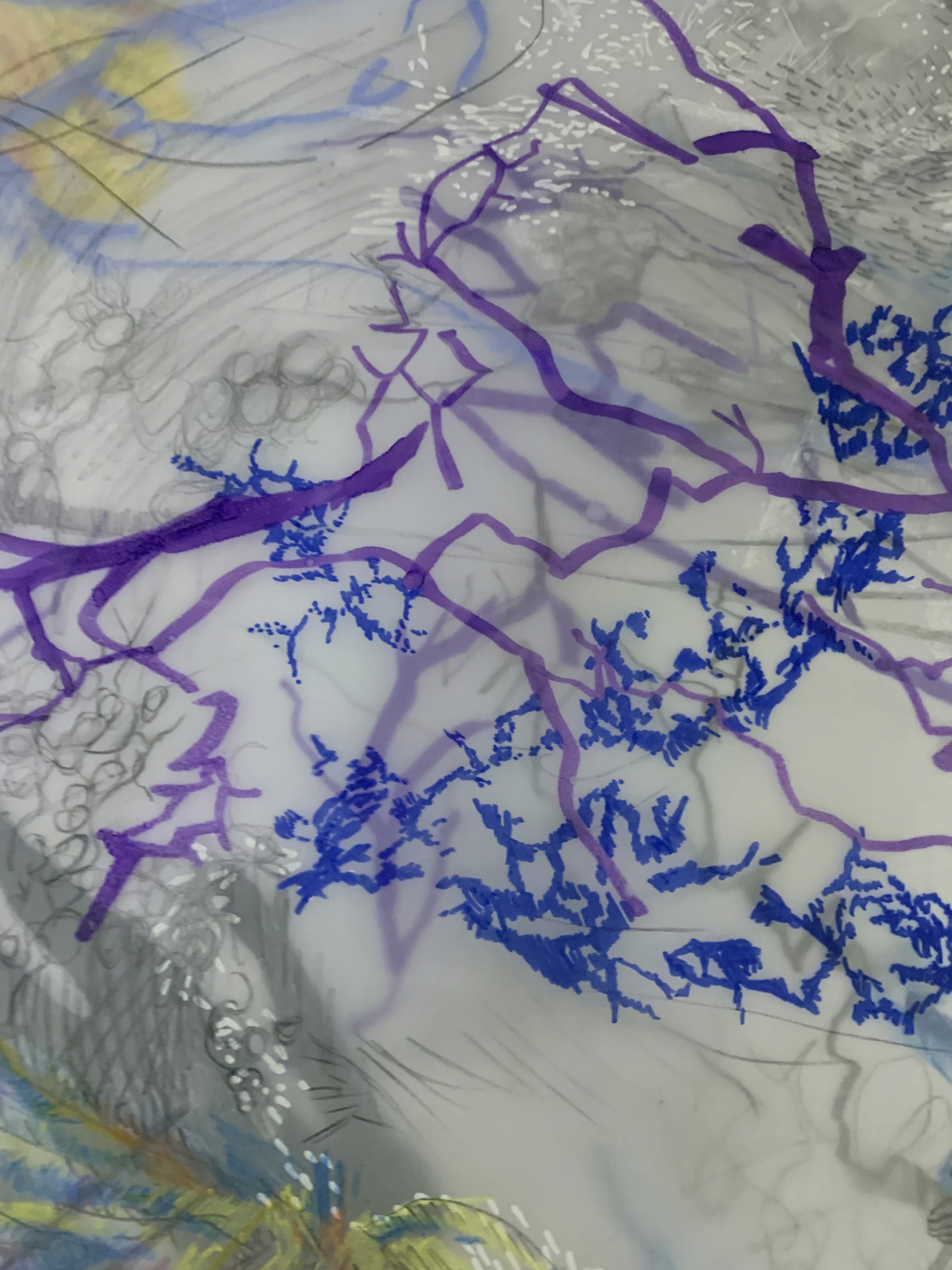 The 68 kilo-meter long Juksei, runs through the poorest and wealthiest parts of Johannesburg, is used for washing, ablutions, baptisms and recreation. I decided to create a drawing, with the scale of 1:2000m, mapping the social realities and cultural complexities of the Jukskei river. The length of the drawing is 34m. This was my first time working on such a large drawing. It took 6 months of drawing daily, to get to this length. I could only see 1.5m of the drawing, at a time, while working; the drawing literally unrolled, as the months passed. I used semi-transparent paper, and worked on both sides, to visually represent the process of reflecting, looking below the surface, to understand the complex dynamics and significance of the river, and the impact of humans on the ecosystem. The time and scale afforded me a chance to experiment with materials, symbolism, complexity, space, scale changes and repetition. The drawing is a portrait of sorts; homage and lamentation. I wanted it to be crazy: big, beautiful and glowing, but also horrific, not shying away from the floating pollution, and dead bodies that have been found there. I shared images and videos of work in progress, with Gavin and Cameron who worked on the sonic component of the installation. After months of working together, I see conceptual, material and formal links between the drawing and the sonic elements.