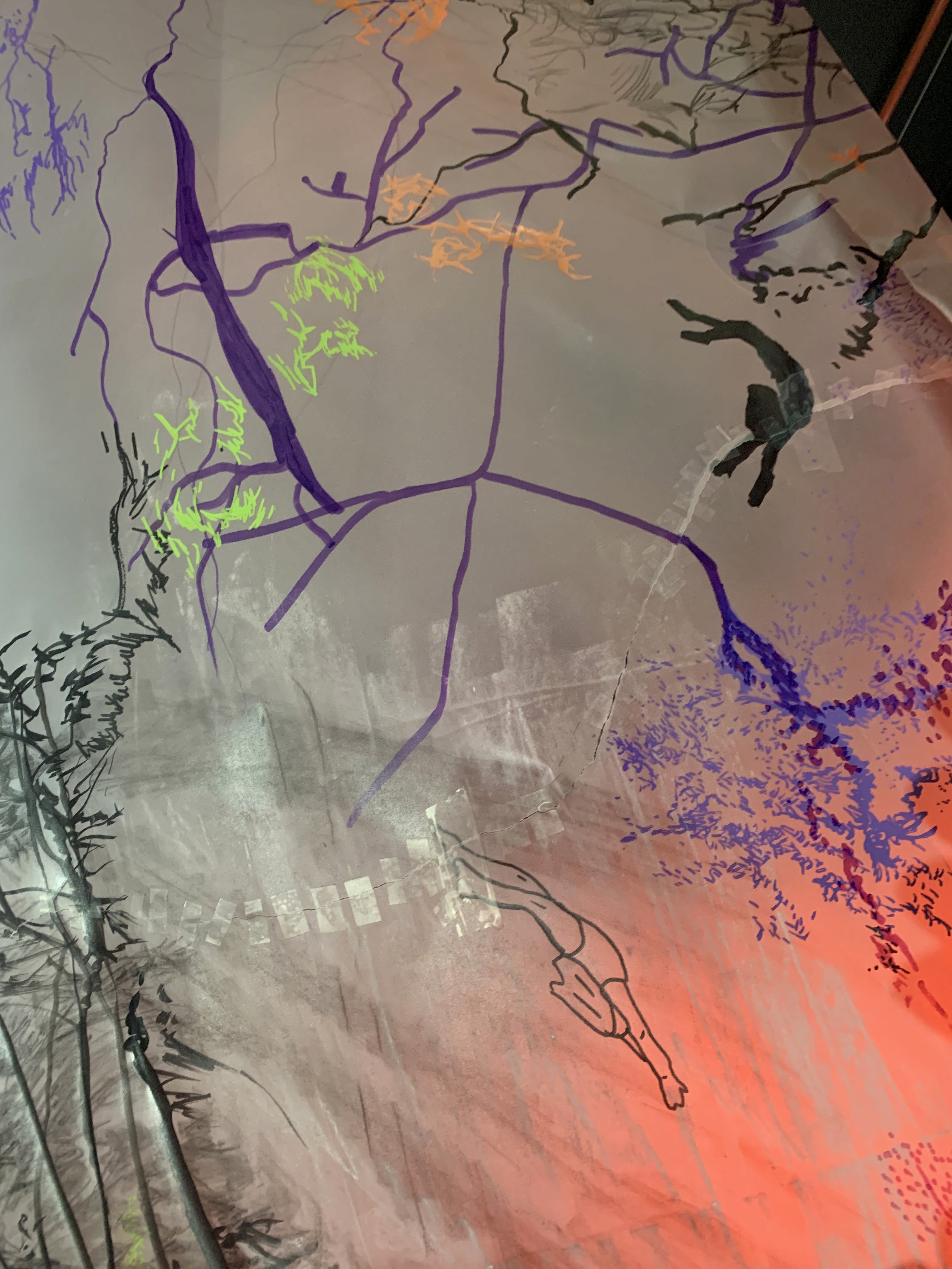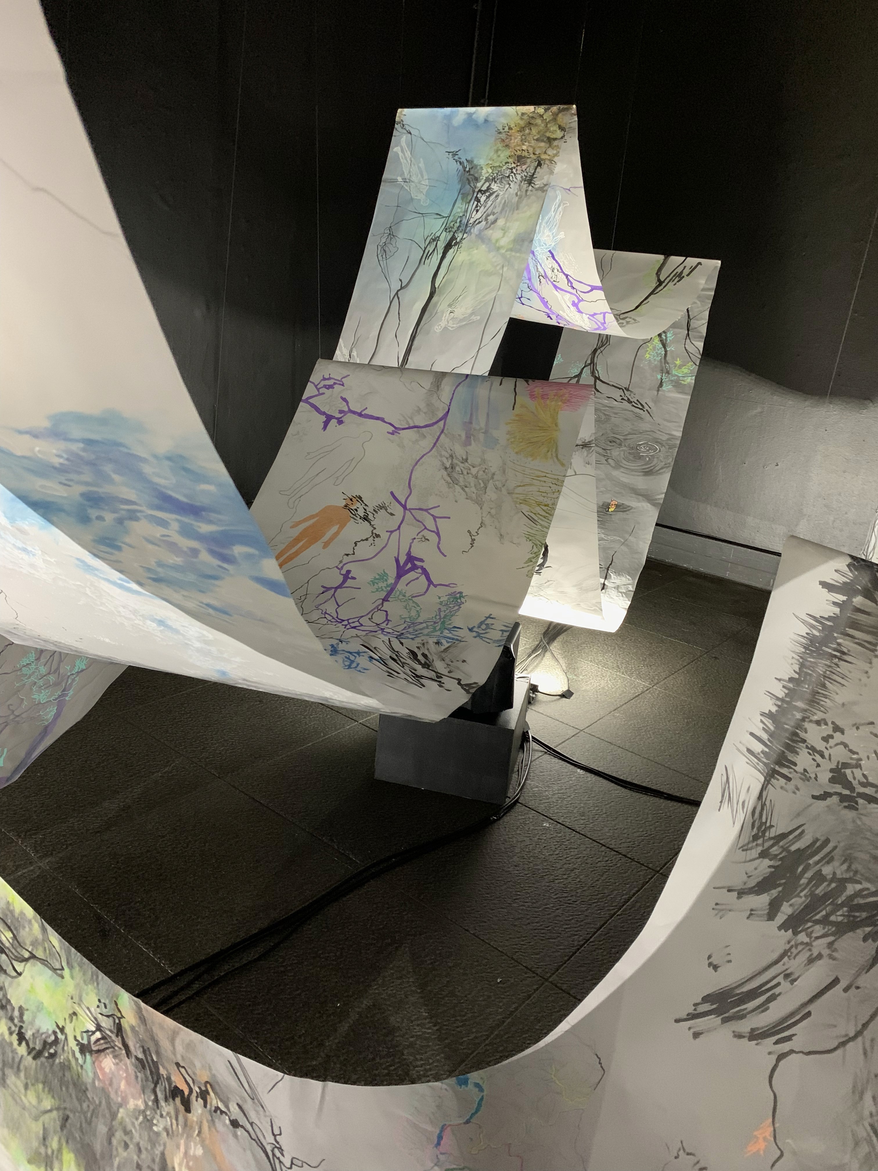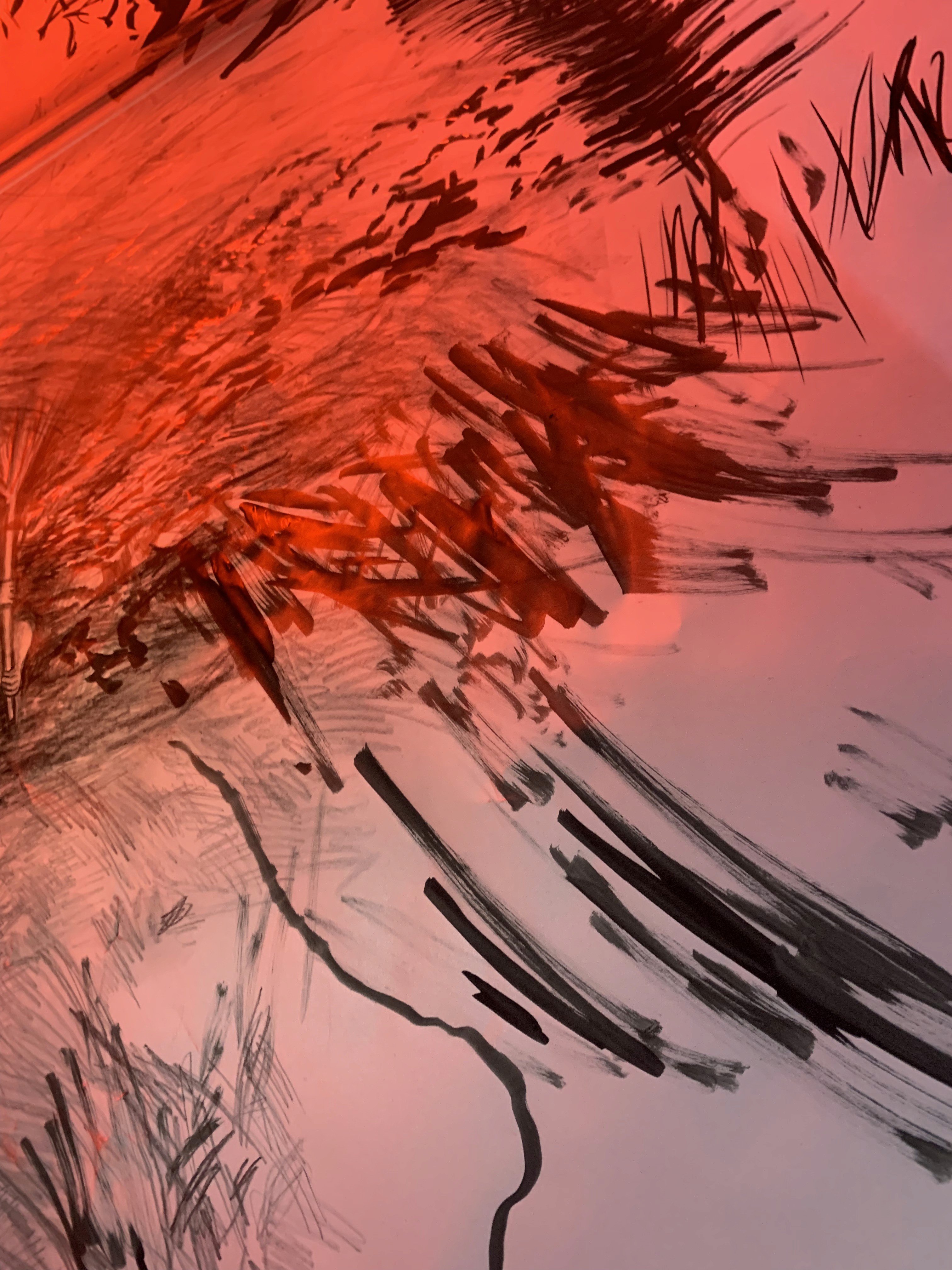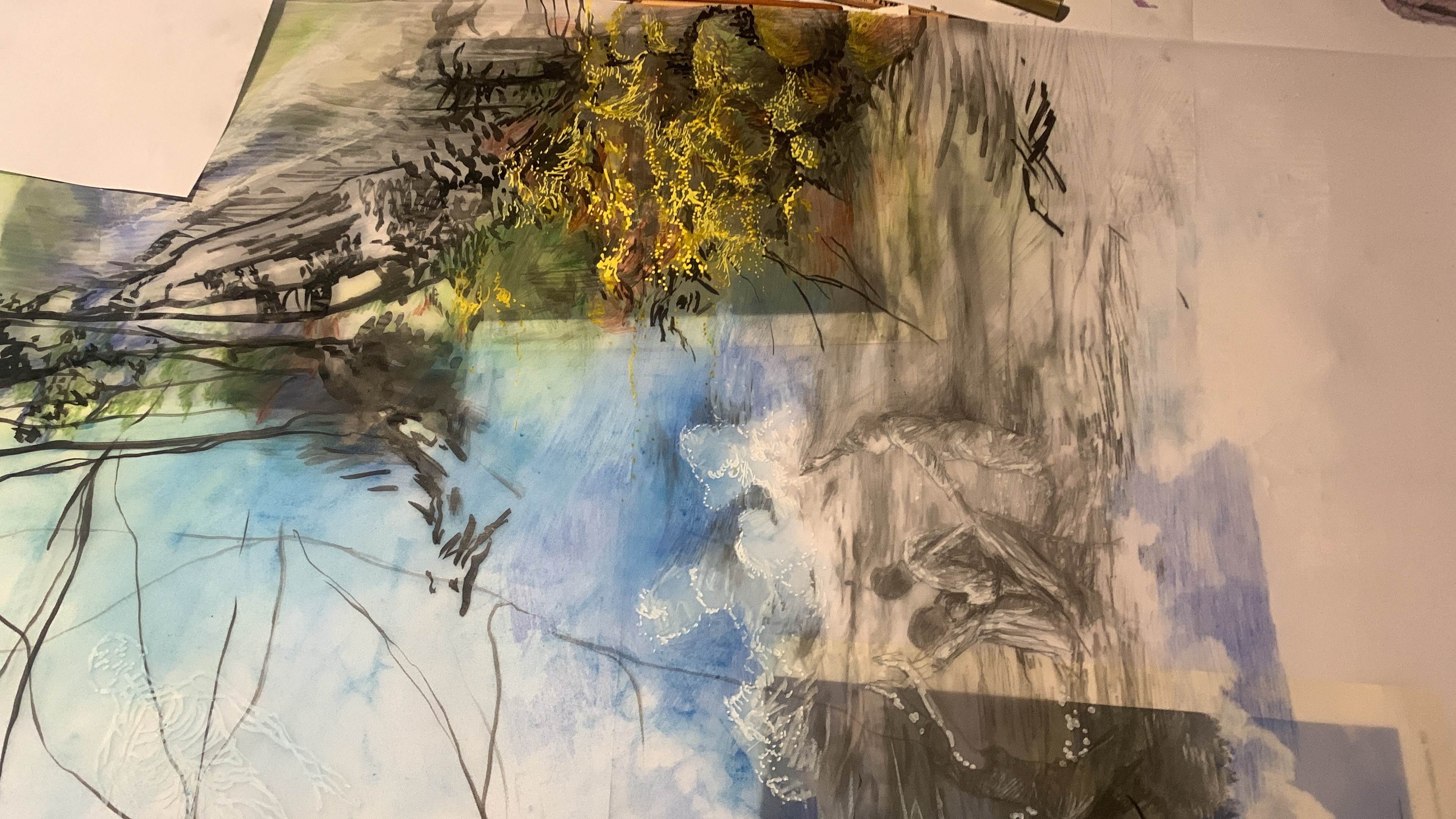 The 68 kilo-meter long Juksei, runs through the poorest and wealthiest parts of Johannesburg, is used for washing, ablutions, baptisms and recreation. I decided to create a drawing, with the scale of 1:2000m, mapping the social realities and cultural complexities of the Jukskei river. The length of the drawing is 34m. This was my first time working on such a large drawing. It took 6 months of drawing daily, to get to this length. I could only see 1.5m of the drawing, at a time, while working; the drawing literally unrolled, as the months passed. I used semi-transparent paper, and worked on both sides, to visually represent the process of reflecting, looking below the surface, to understand the complex dynamics and significance of the river, and the impact of humans on the ecosystem. The time and scale afforded me a chance to experiment with materials, symbolism, complexity, space, scale changes and repetition. The drawing is a portrait of sorts; homage and lamentation. I wanted it to be crazy: big, beautiful and glowing, but also horrific, not shying away from the floating pollution, and dead bodies that have been found there. I shared images and videos of work in progress, with Gavin and Cameron who worked on the sonic component of the installation. After months of working together, I see conceptual, material and formal links between the drawing and the sonic elements.
