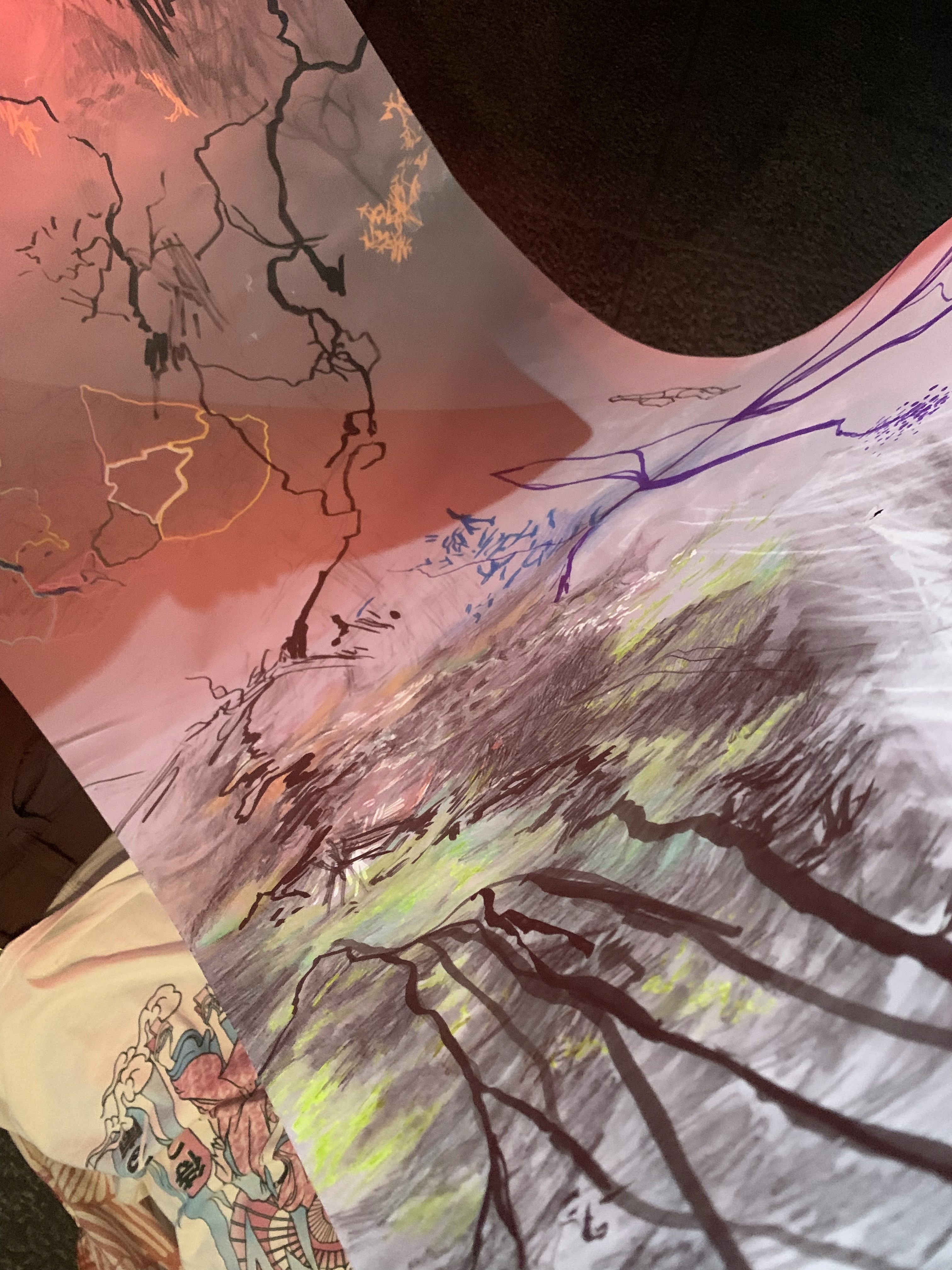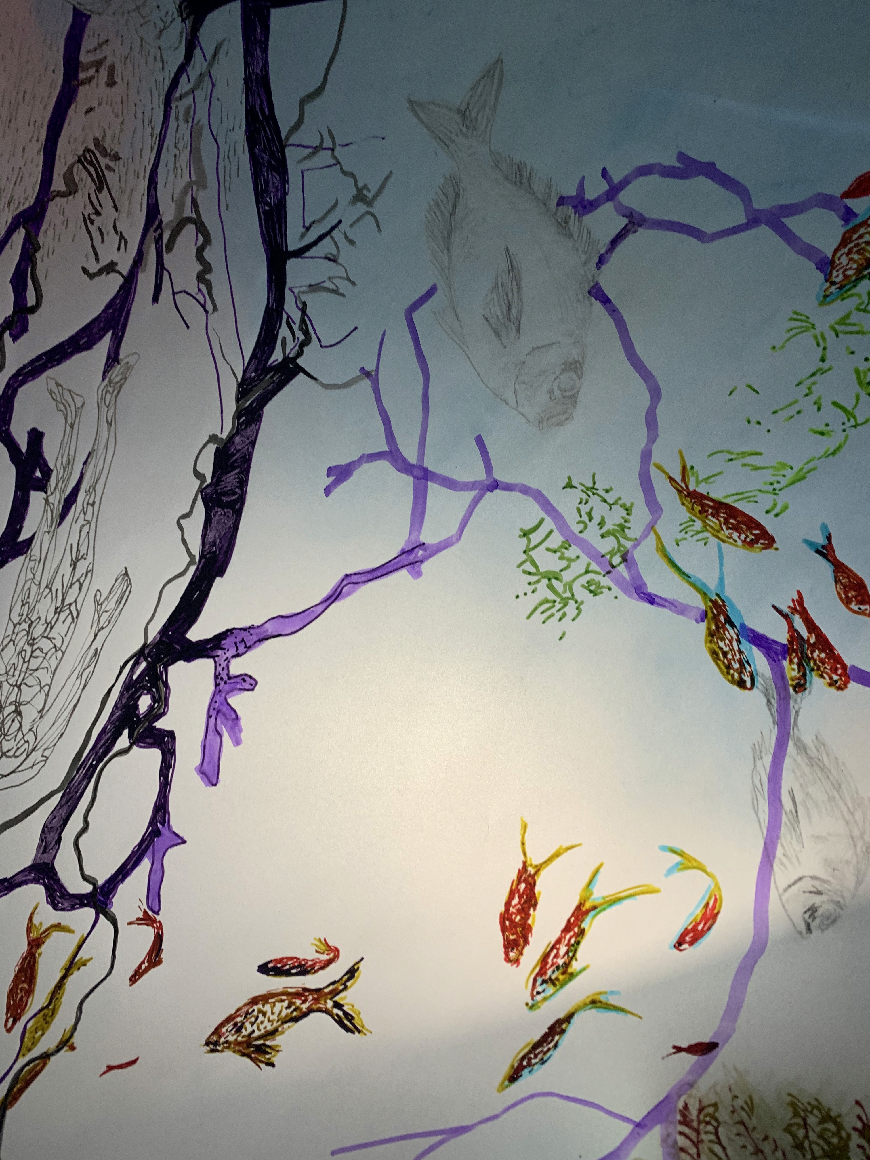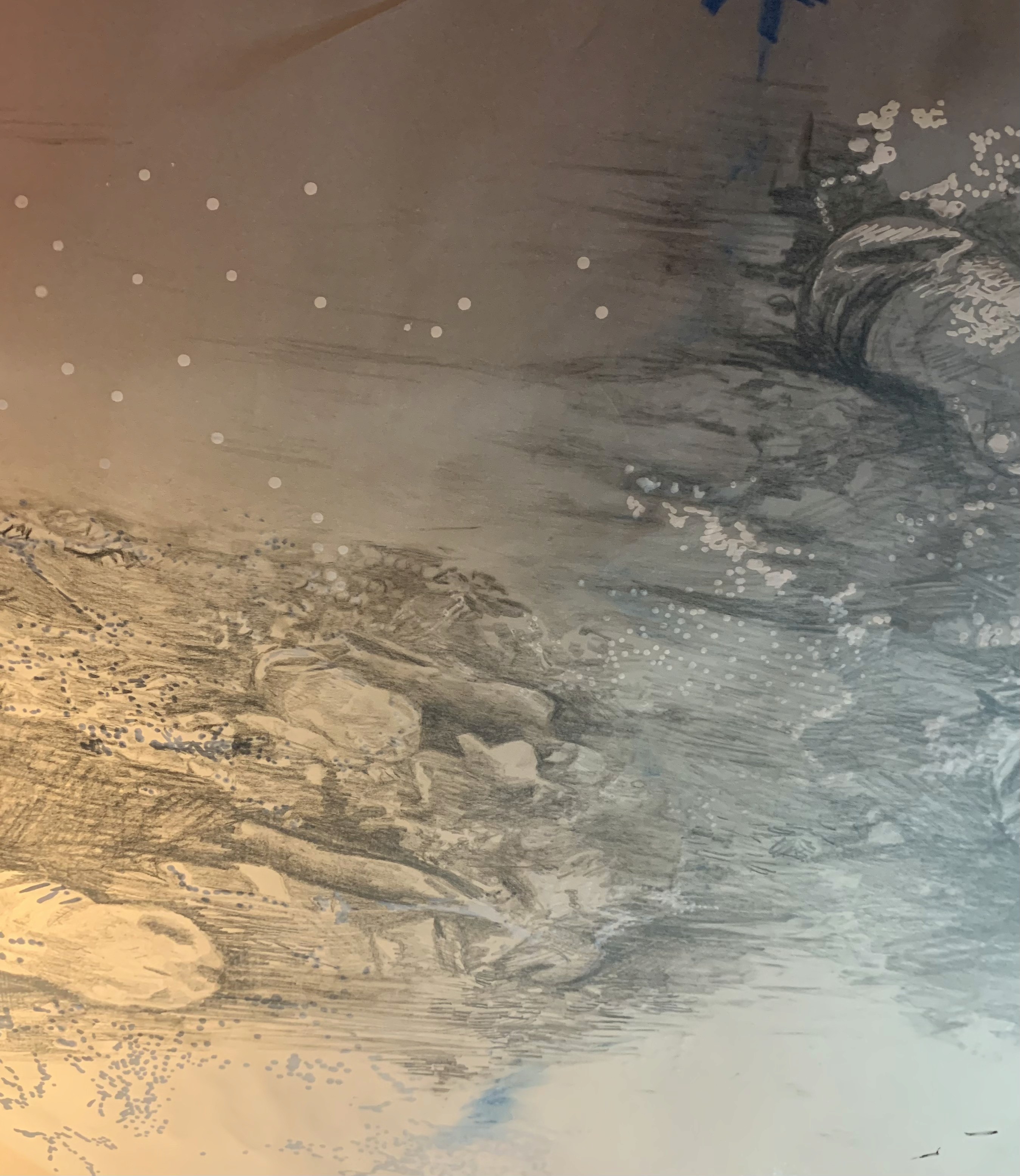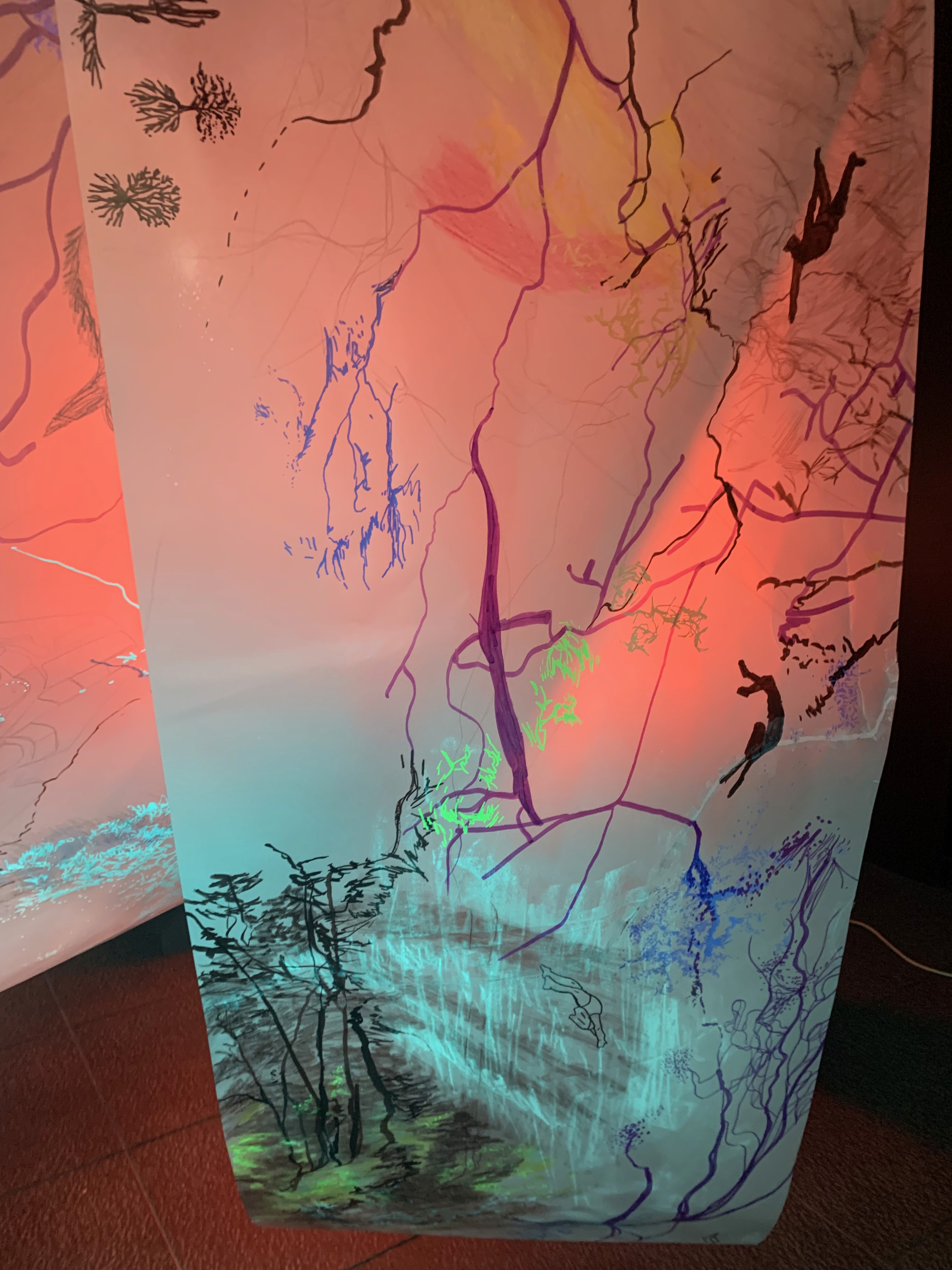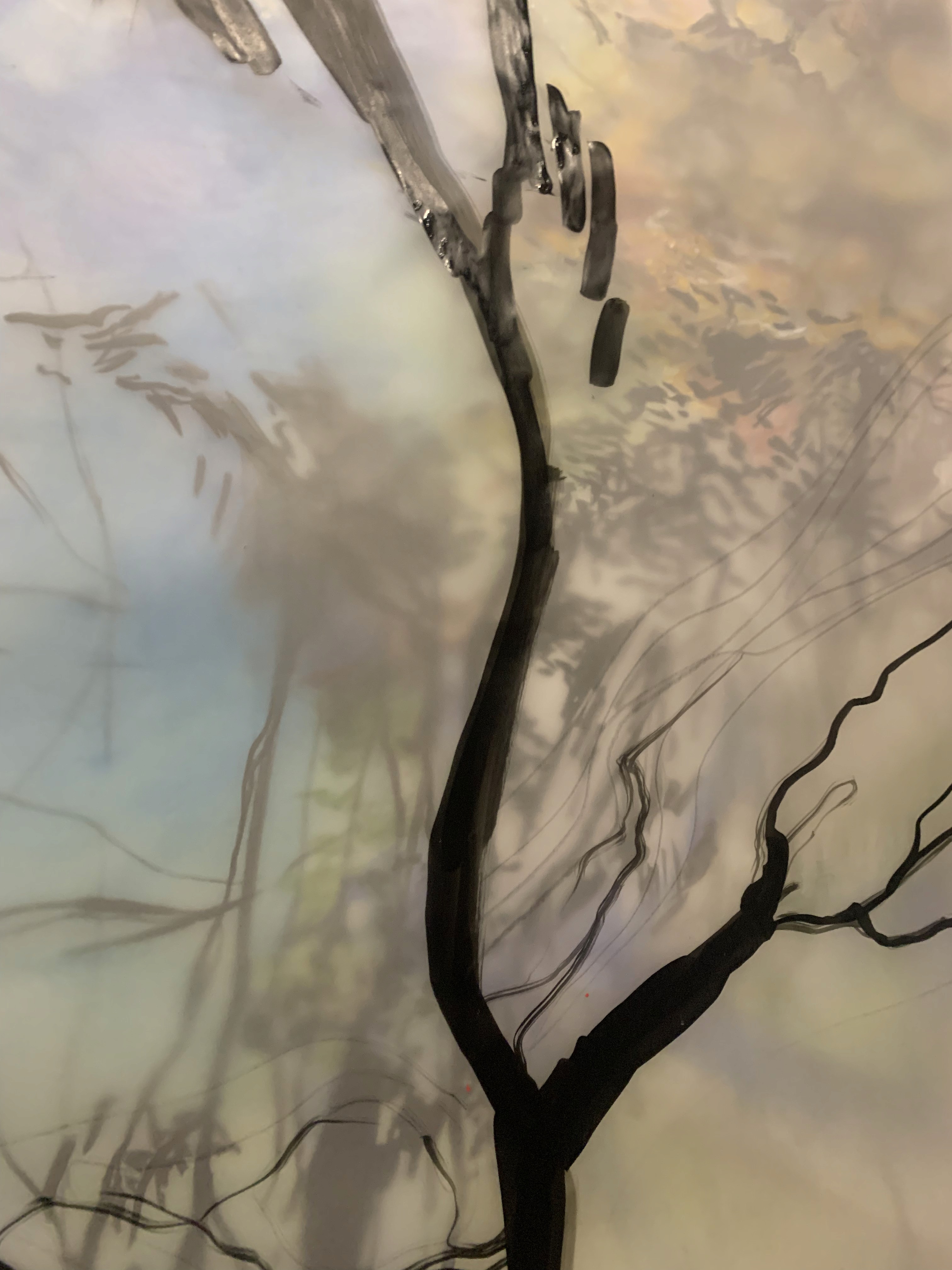 The 68 kilo-meter long Juksei, runs through the poorest and wealthiest parts of Johannesburg, is used for washing, ablutions, baptisms and recreation. I decided to create a drawing, with the scale of 1:2000m, mapping the social realities and cultural complexities of the Jukskei river. The length of the drawing is 34m. This was my first time working on such a large drawing. It took 6 months of drawing daily, to get to this length. I could only see 1.5m of the drawing, at a time, while working; the drawing literally unrolled, as the months passed. I used semi-transparent paper, and worked on both sides, to visually represent the process of reflecting, looking below the surface, to understand the complex dynamics and significance of the river, and the impact of humans on the ecosystem. The time and scale afforded me a chance to experiment with materials, symbolism, complexity, space, scale changes and repetition. The drawing is a portrait of sorts; homage and lamentation. I wanted it to be crazy: big, beautiful and glowing, but also horrific, not shying away from the floating pollution, and dead bodies that have been found there. I shared images and videos of work in progress, with Gavin and Cameron who worked on the sonic component of the installation. After months of working together, I see conceptual, material and formal links between the drawing and the sonic elements.