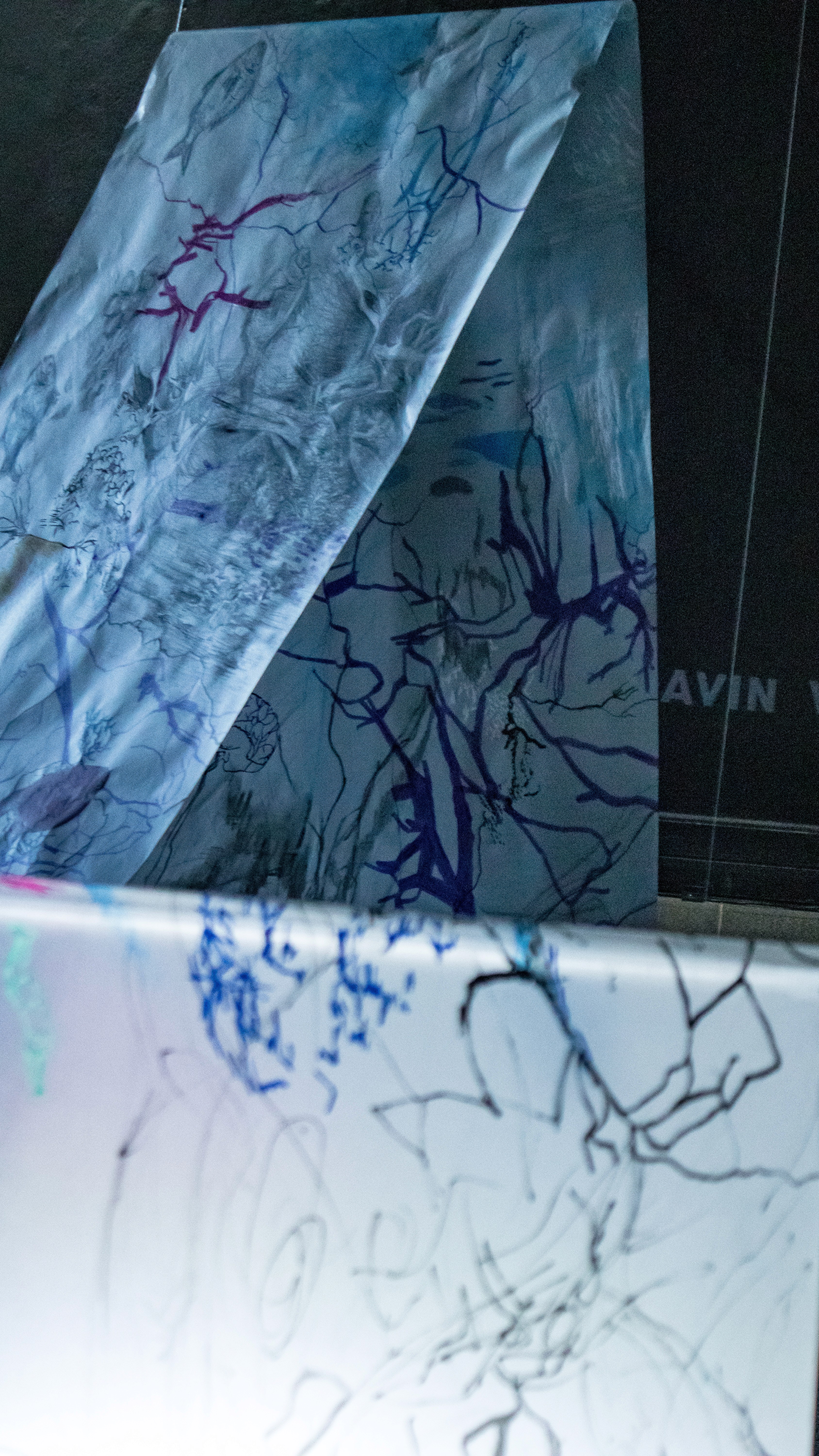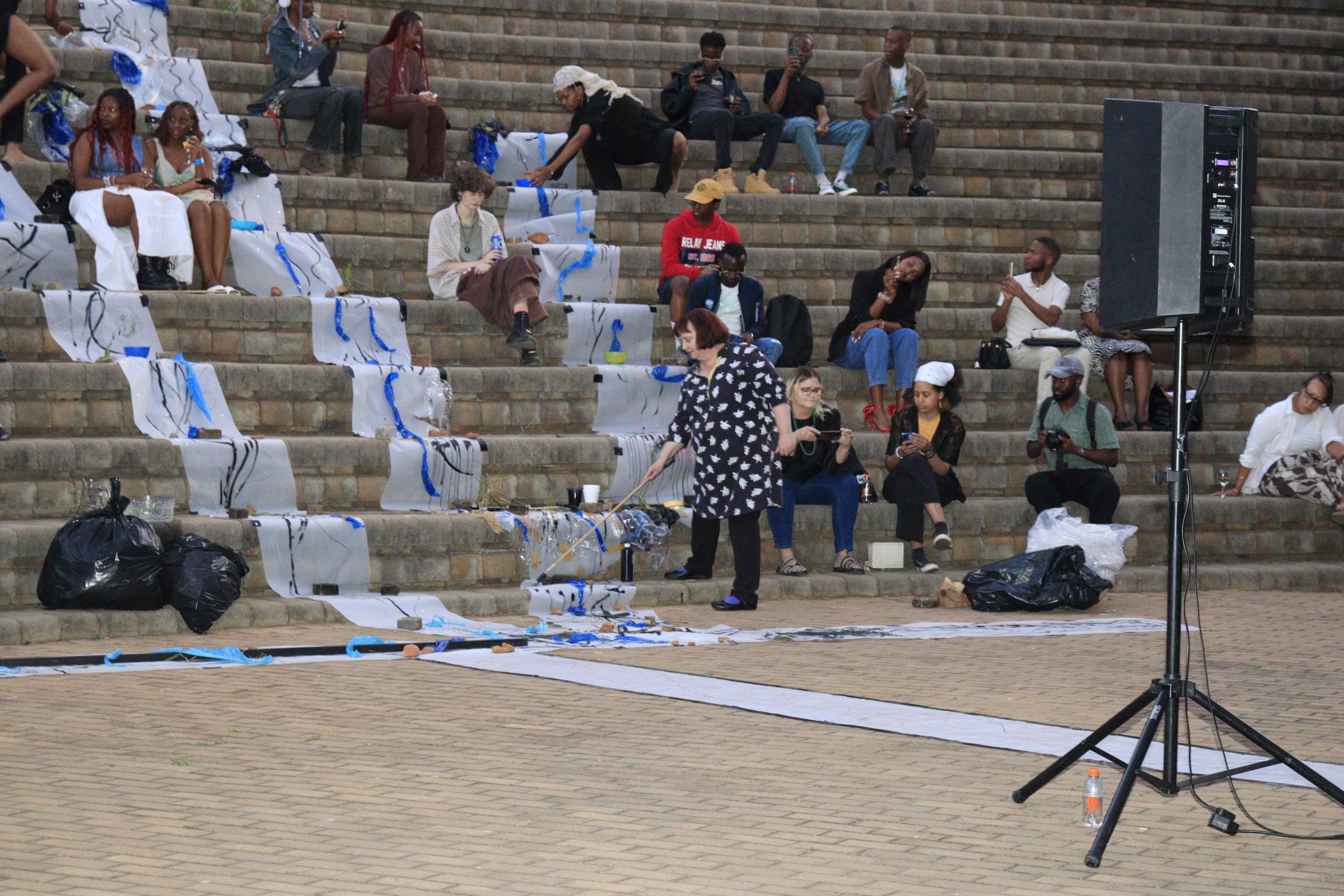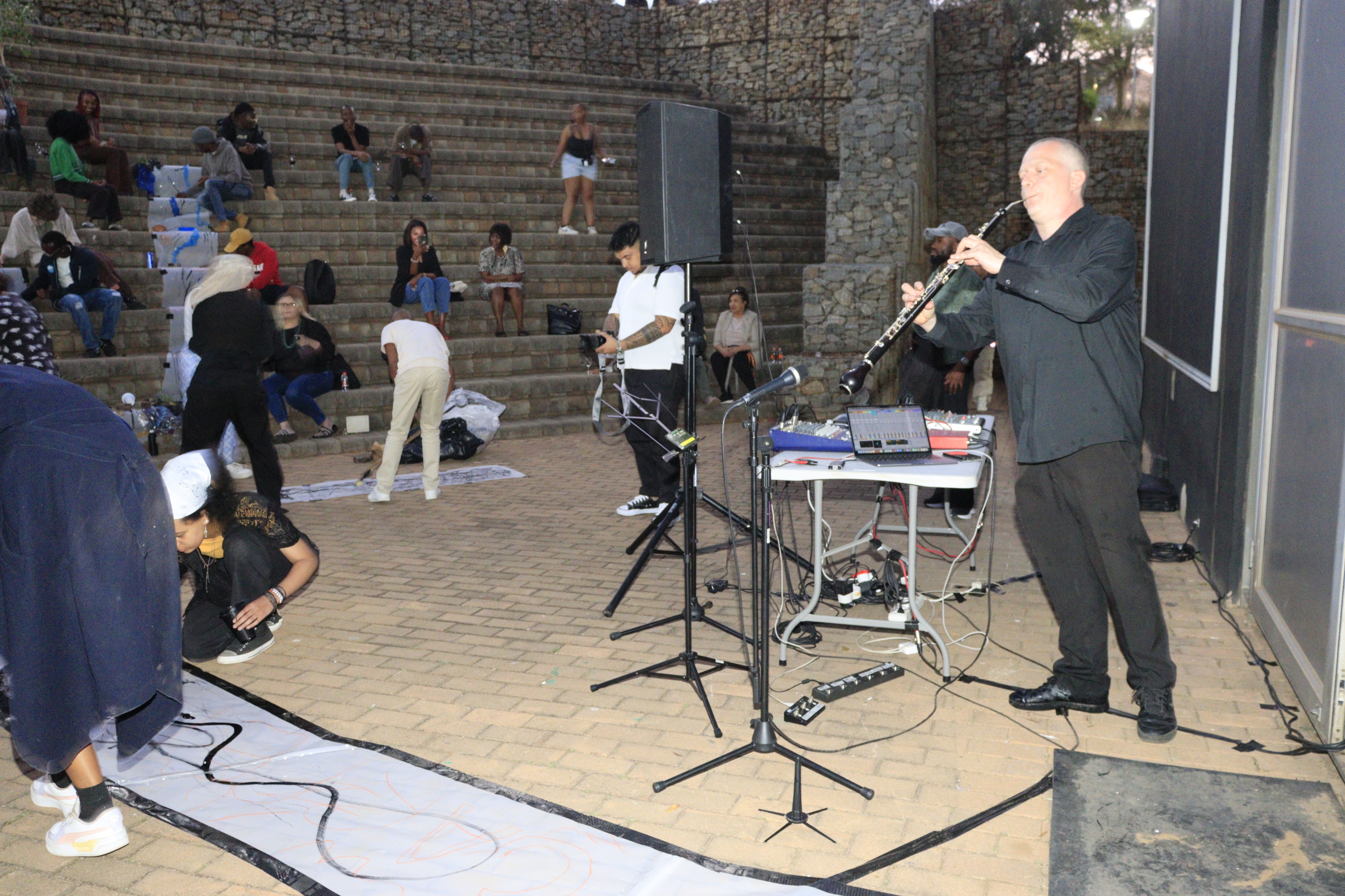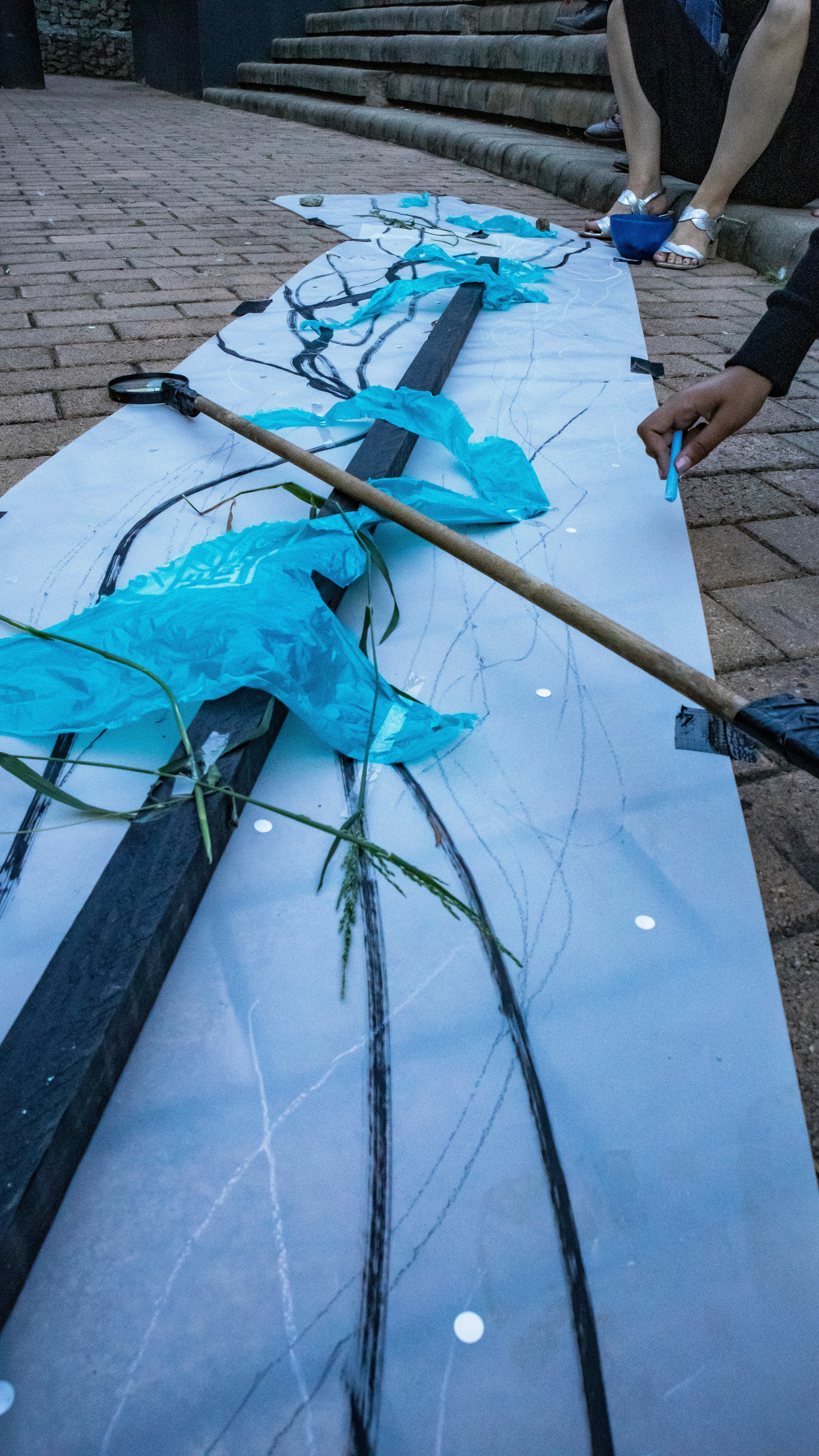 We created three paper tributaries, that appeared to flow down the steps of the atrium outside the FADA Gallery. The three tributaries converged in to one stream that led gallery visitors into the gallery, where Confluence was installed. We added plastics to the paper tributaries for colour, sound, and to represent the polluting of rivers. Natalie, Nqobile and Alison drew on the paper rivers, and tried to clean away the plastic pollution. A roaming mic was used to capture the sounds of the drawing performance. These sounds were synthesized in real time, on a mixing deck by Cameron Harris, who added sounds from playing an Oboe. The performance was a live presentation of the process Cameron, Gavin and Alison used to create Confluence. During the performance of “The Sound of Drawing”, audience members were invited to participate in adding marks to the paper river and clearing up the plastics. The roaming microphone captured the sounds of the audiences’ drawing, which were added to the emerging composition. The invitation to co-create the performance through interaction symbolized the need for individuals to come together to save our waterways.