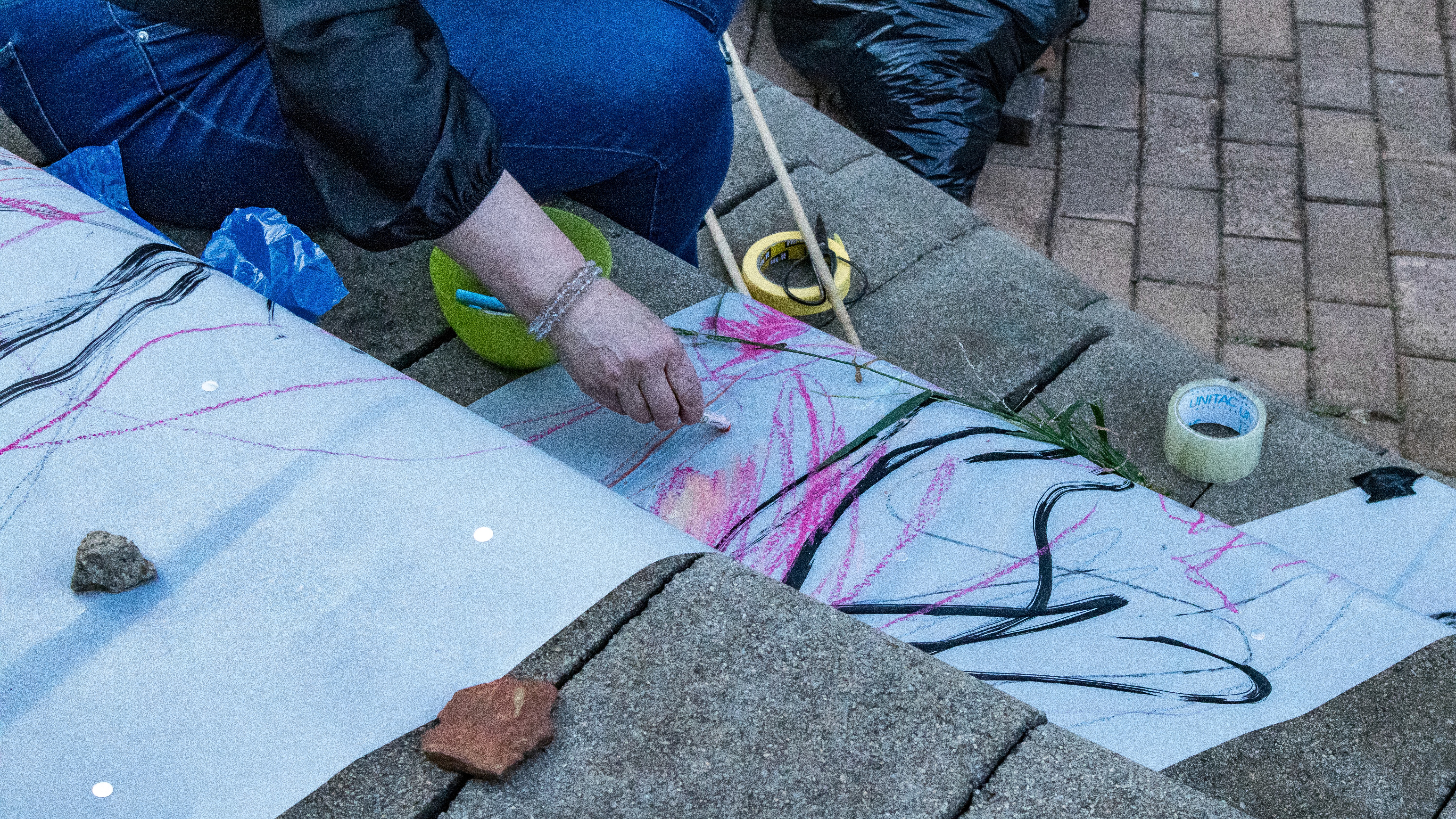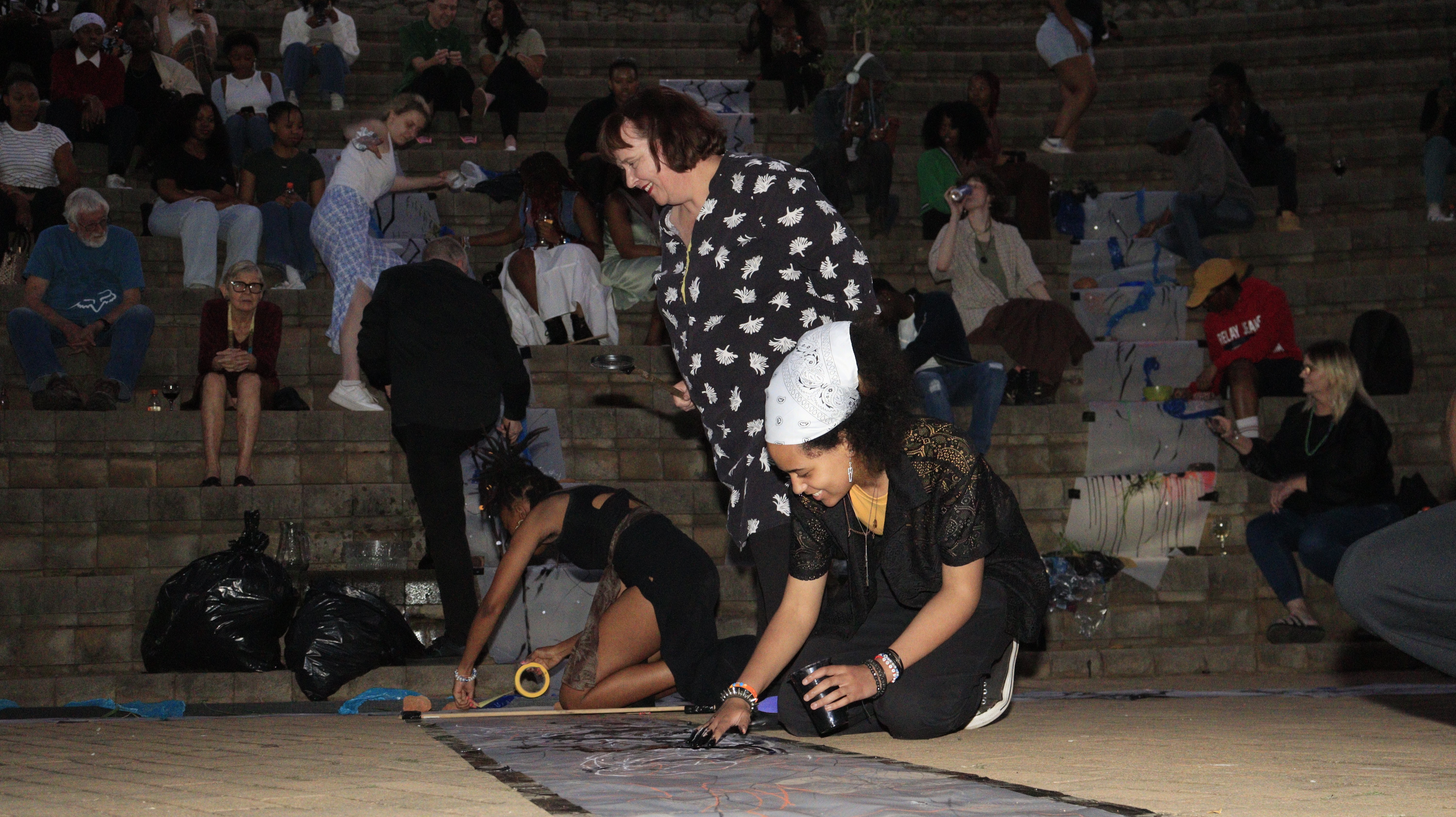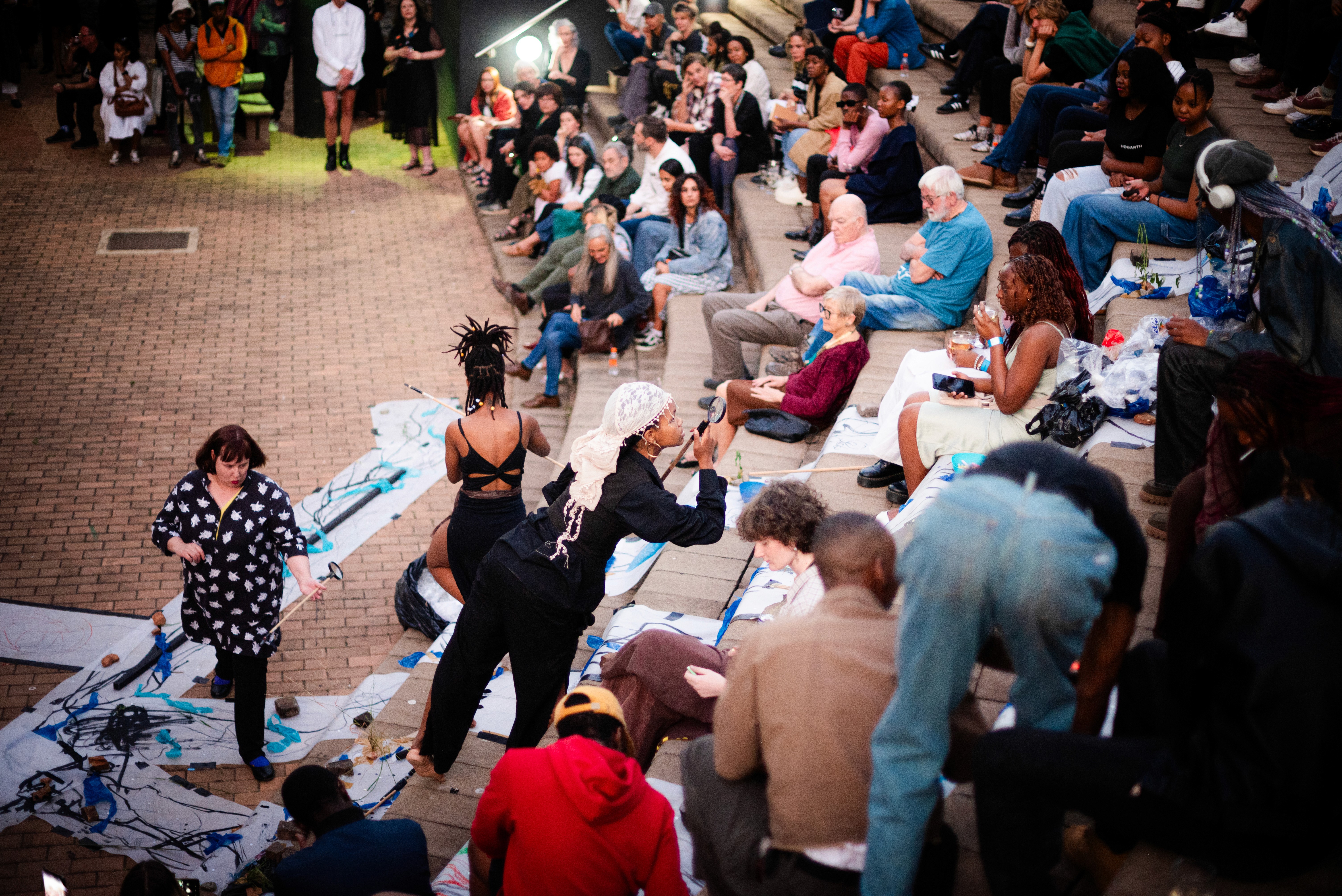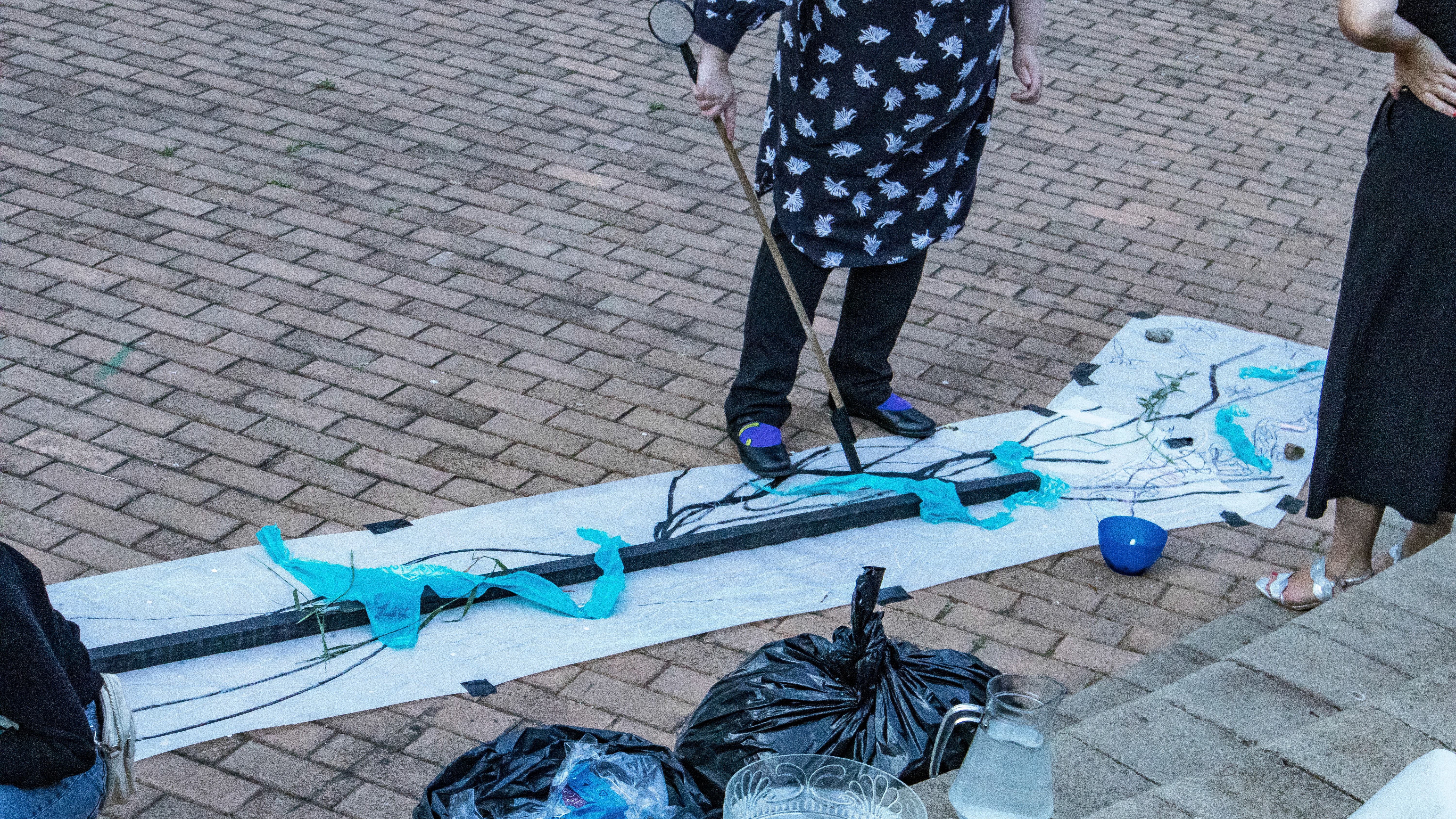 We created three paper tributaries, that appeared to flow down the steps of the atrium outside the FADA Gallery. The three tributaries converged in to one stream that led gallery visitors into the gallery, where Confluence was installed. We added plastics to the paper tributaries for colour, sound, and to represent the polluting of rivers. Natalie, Nqobile and Alison drew on the paper rivers, and tried to clean away the plastic pollution. A roaming mic was used to capture the sounds of the drawing performance. These sounds were synthesized in real time, on a mixing deck by Cameron Harris, who added sounds from playing an Oboe. The performance was a live presentation of the process Cameron, Gavin and Alison used to create Confluence. During the performance of “The Sound of Drawing”, audience members were invited to participate in adding marks to the paper river and clearing up the plastics. The roaming microphone captured the sounds of the audiences’ drawing, which were added to the emerging composition. The invitation to co-create the performance through interaction symbolized the need for individuals to come together to save our waterways.
