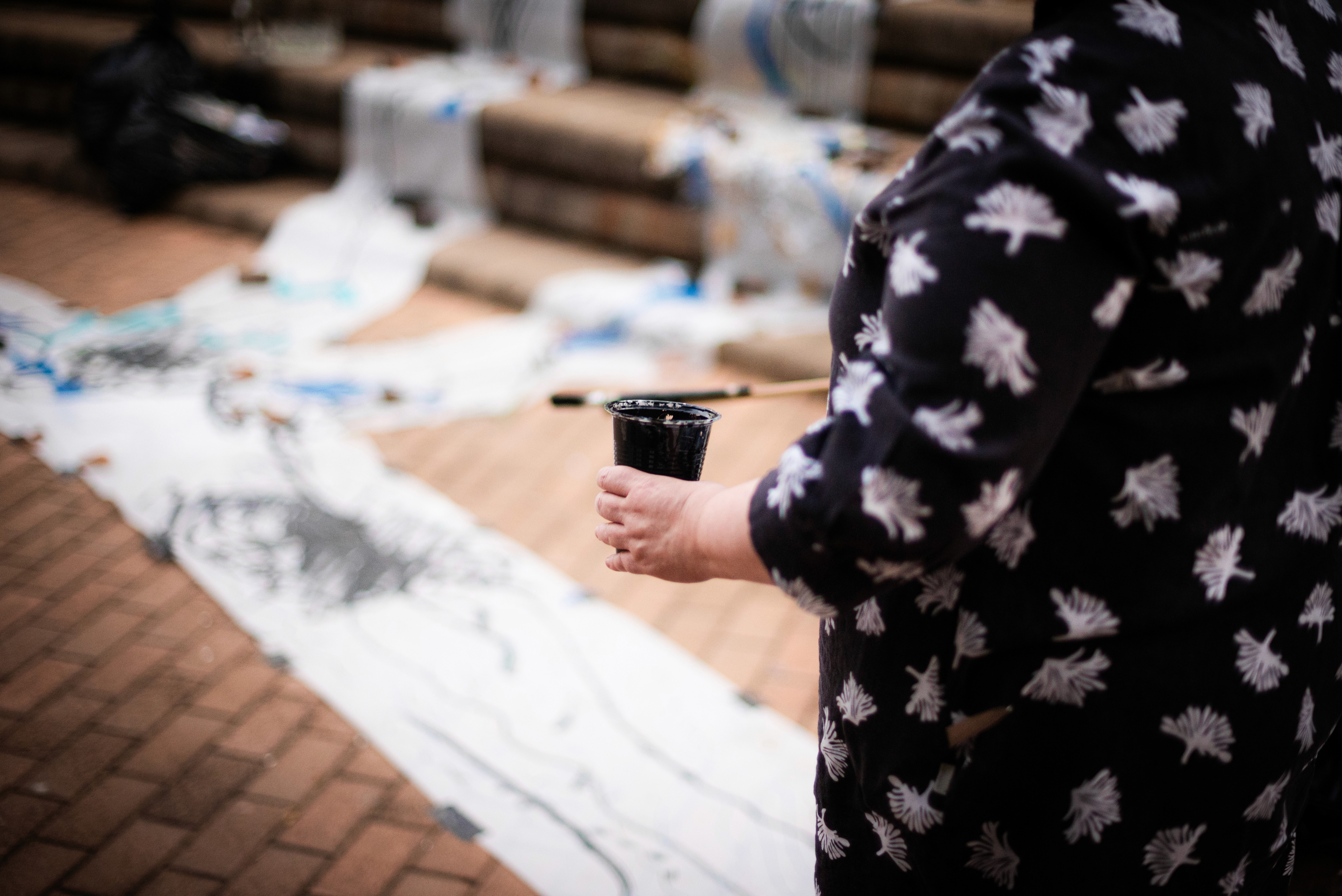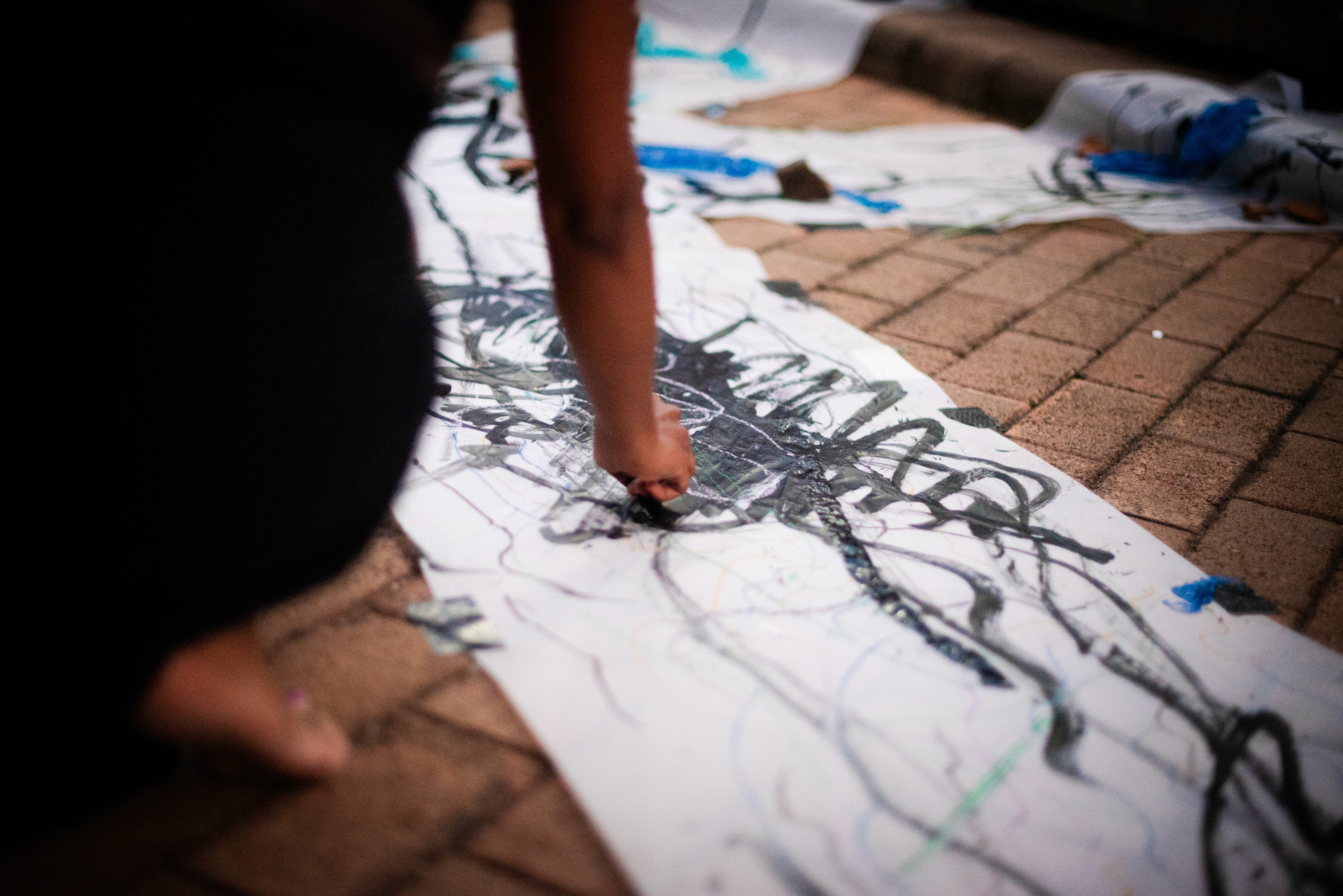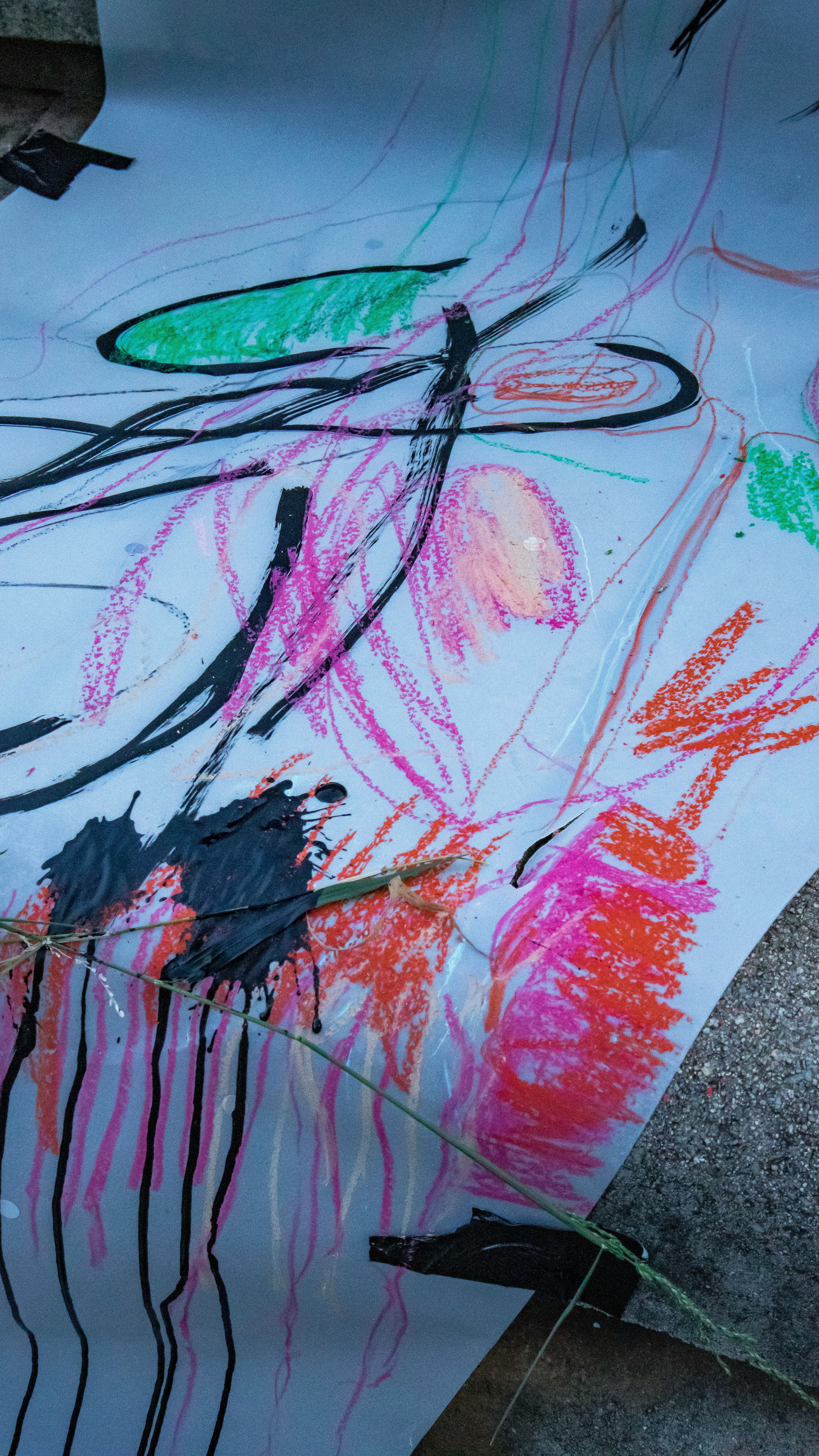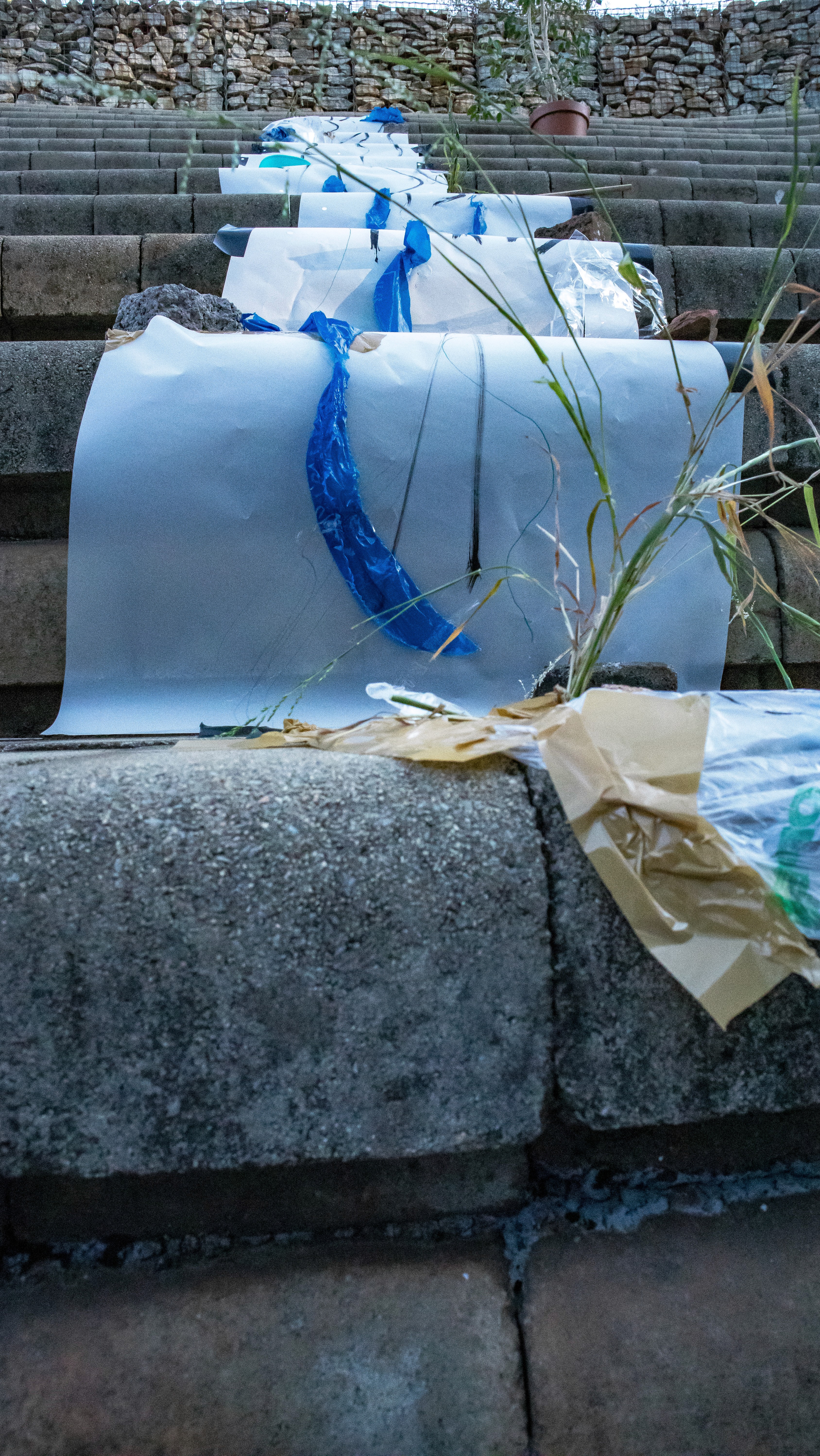 We created three paper tributaries, that appeared to flow down the steps of the atrium outside the FADA Gallery. The three tributaries converged in to one stream that led gallery visitors into the gallery, where Confluence was installed. We added plastics to the paper tributaries for colour, sound, and to represent the polluting of rivers. Natalie, Nqobile and Alison drew on the paper rivers, and tried to clean away the plastic pollution. A roaming mic was used to capture the sounds of the drawing performance. These sounds were synthesized in real time, on a mixing deck by Cameron Harris, who added sounds from playing an Oboe. The performance was a live presentation of the process Cameron, Gavin and Alison used to create Confluence. During the performance of “The Sound of Drawing”, audience members were invited to participate in adding marks to the paper river and clearing up the plastics. The roaming microphone captured the sounds of the audiences’ drawing, which were added to the emerging composition. The invitation to co-create the performance through interaction symbolized the need for individuals to come together to save our waterways.