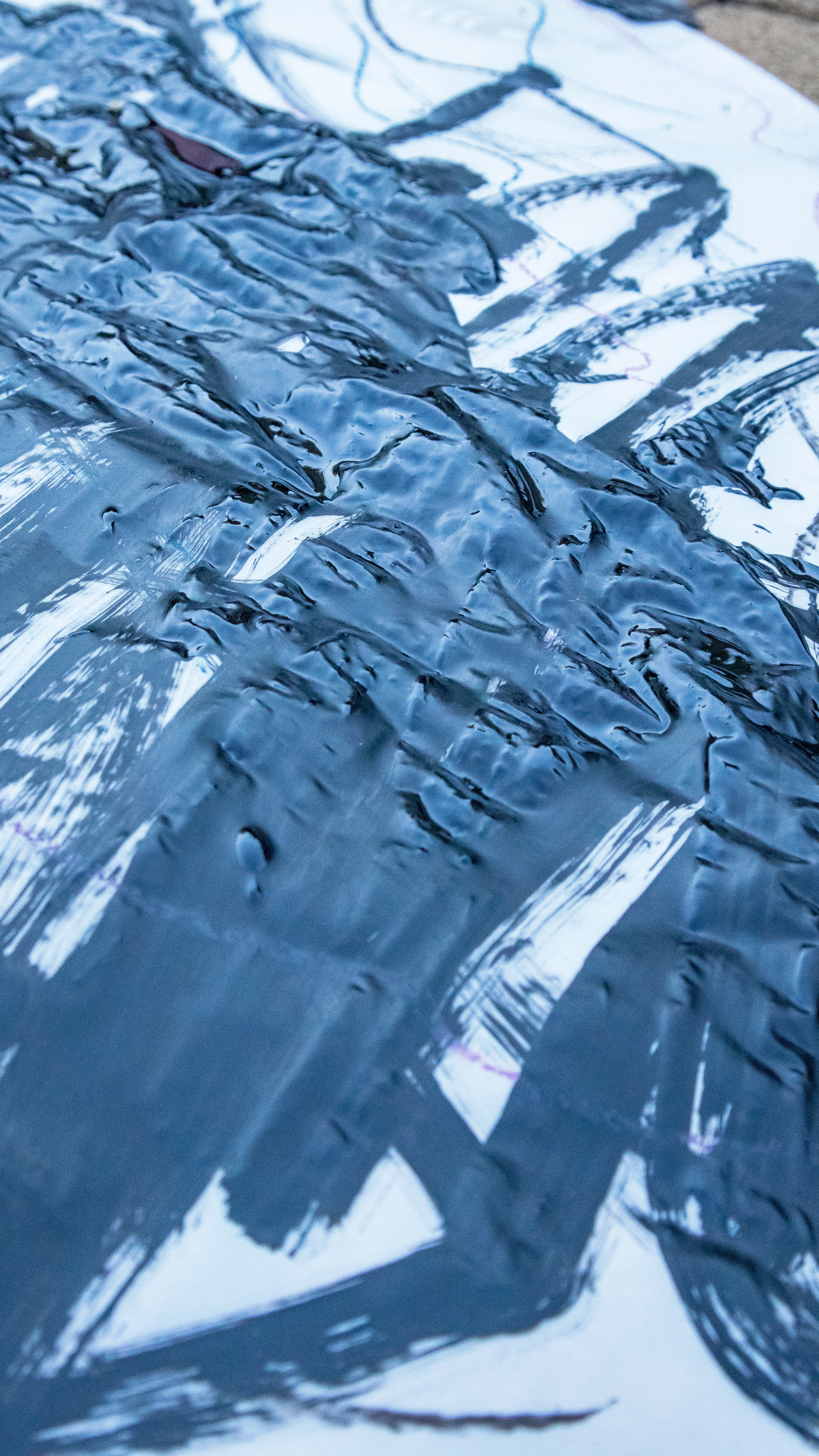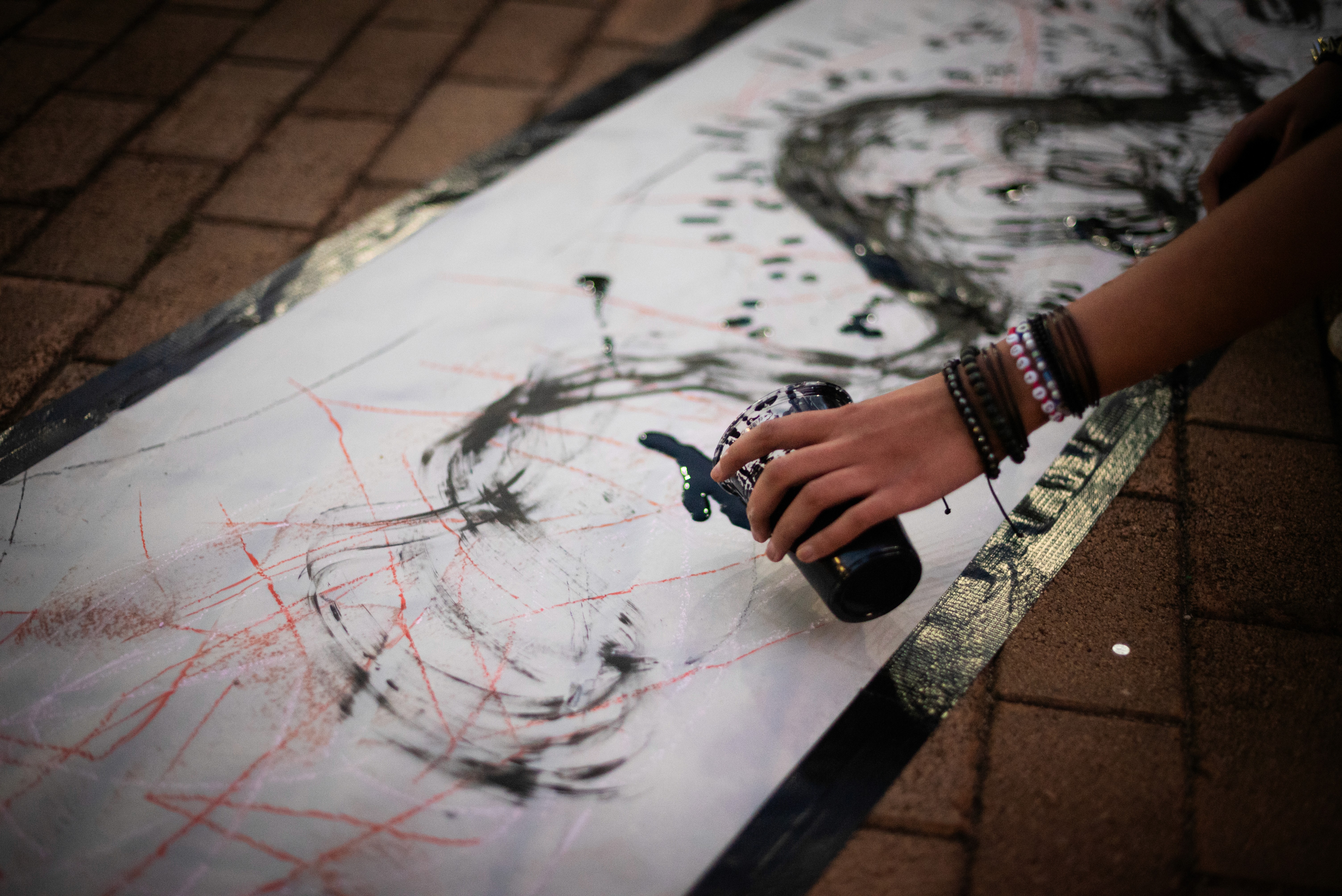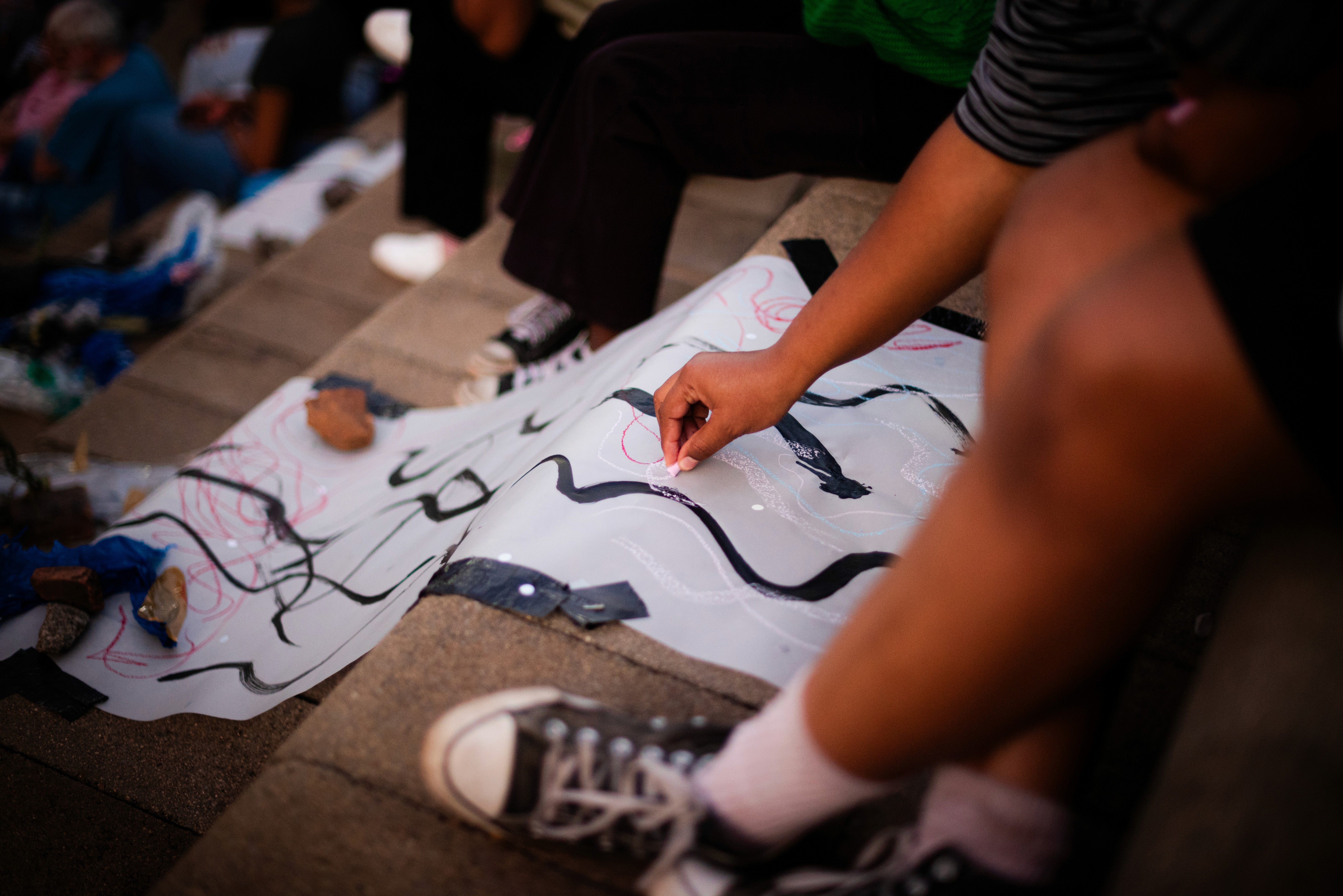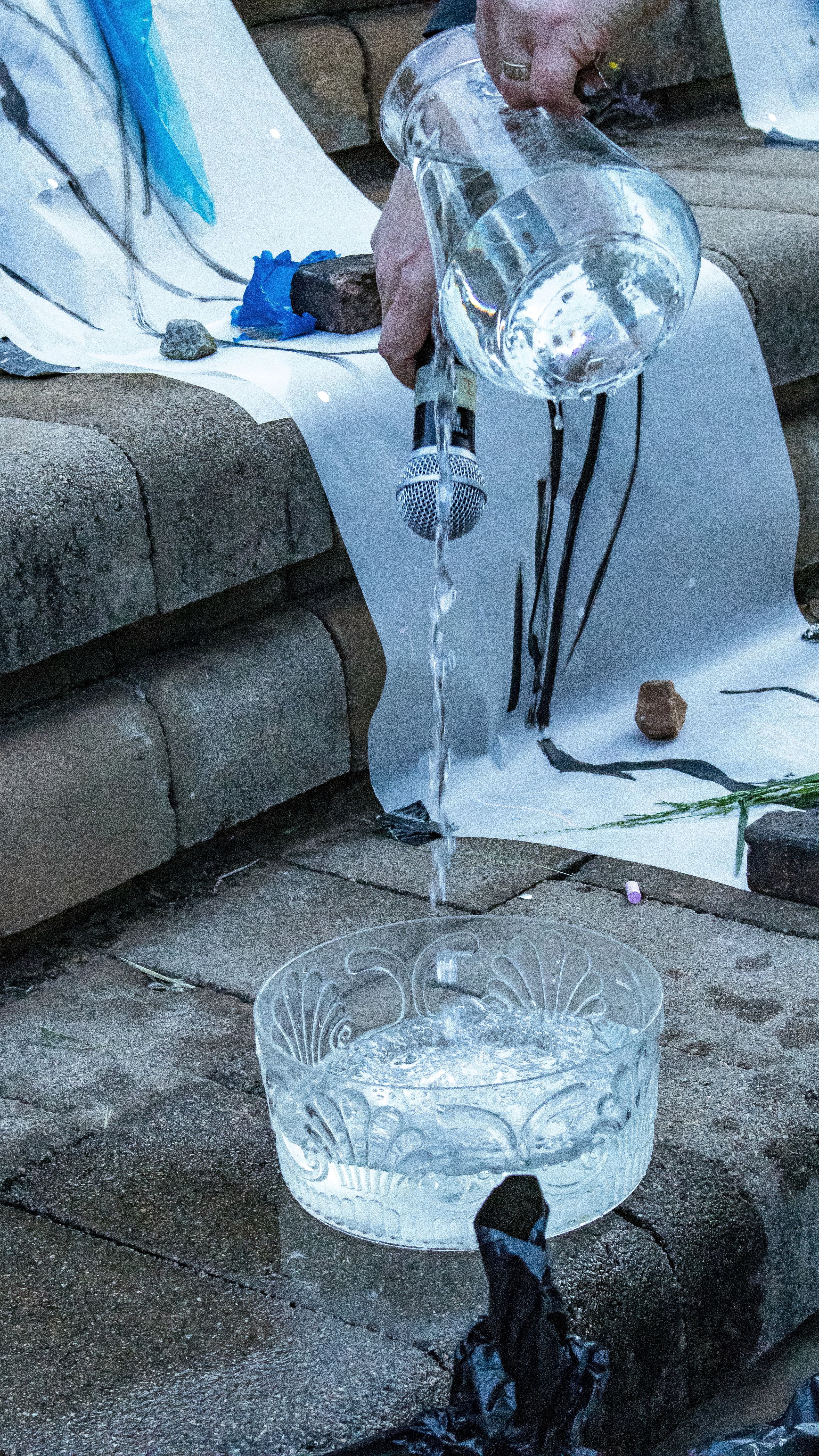 We created three paper tributaries, that appeared to flow down the steps of the atrium outside the FADA Gallery. The three tributaries converged in to one stream that led gallery visitors into the gallery, where Confluence was installed. We added plastics to the paper tributaries for colour, sound, and to represent the polluting of rivers. Natalie, Nqobile and Alison drew on the paper rivers, and tried to clean away the plastic pollution. A roaming mic was used to capture the sounds of the drawing performance. These sounds were synthesized in real time, on a mixing deck by Cameron Harris, who added sounds from playing an Oboe. The performance was a live presentation of the process Cameron, Gavin and Alison used to create Confluence. During the performance of “The Sound of Drawing”, audience members were invited to participate in adding marks to the paper river and clearing up the plastics. The roaming microphone captured the sounds of the audiences’ drawing, which were added to the emerging composition. The invitation to co-create the performance through interaction symbolized the need for individuals to come together to save our waterways.